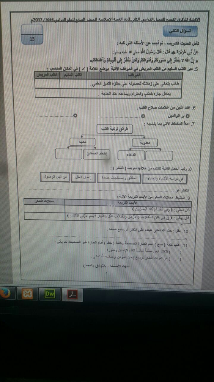 الصف السابع, الفصل الثاني, تربية اسلامية, الاختبار المركزي القصير للعام الدراسي 2016-2017