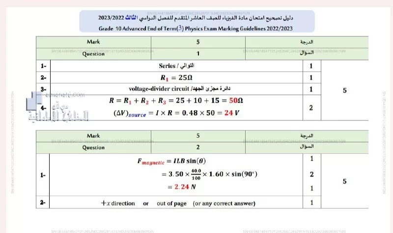 معلومات الملف: نرفق لكم ملف يتضمن دليل تصحيح أسئلة الامتحان النهائي الورقي بريدج وانسباير من مادة الفيزياء للصف العاشر المتقدم الفصل الدراسي الثالث للعام الدراسي 2022-2023.