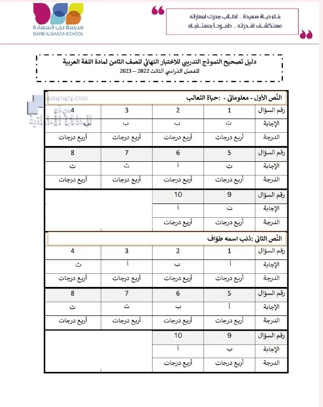 حل نموذج تدريبي على الاختبار الوزاري النهائي - إعداد: مدرسة درب السعادة | ||