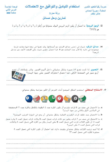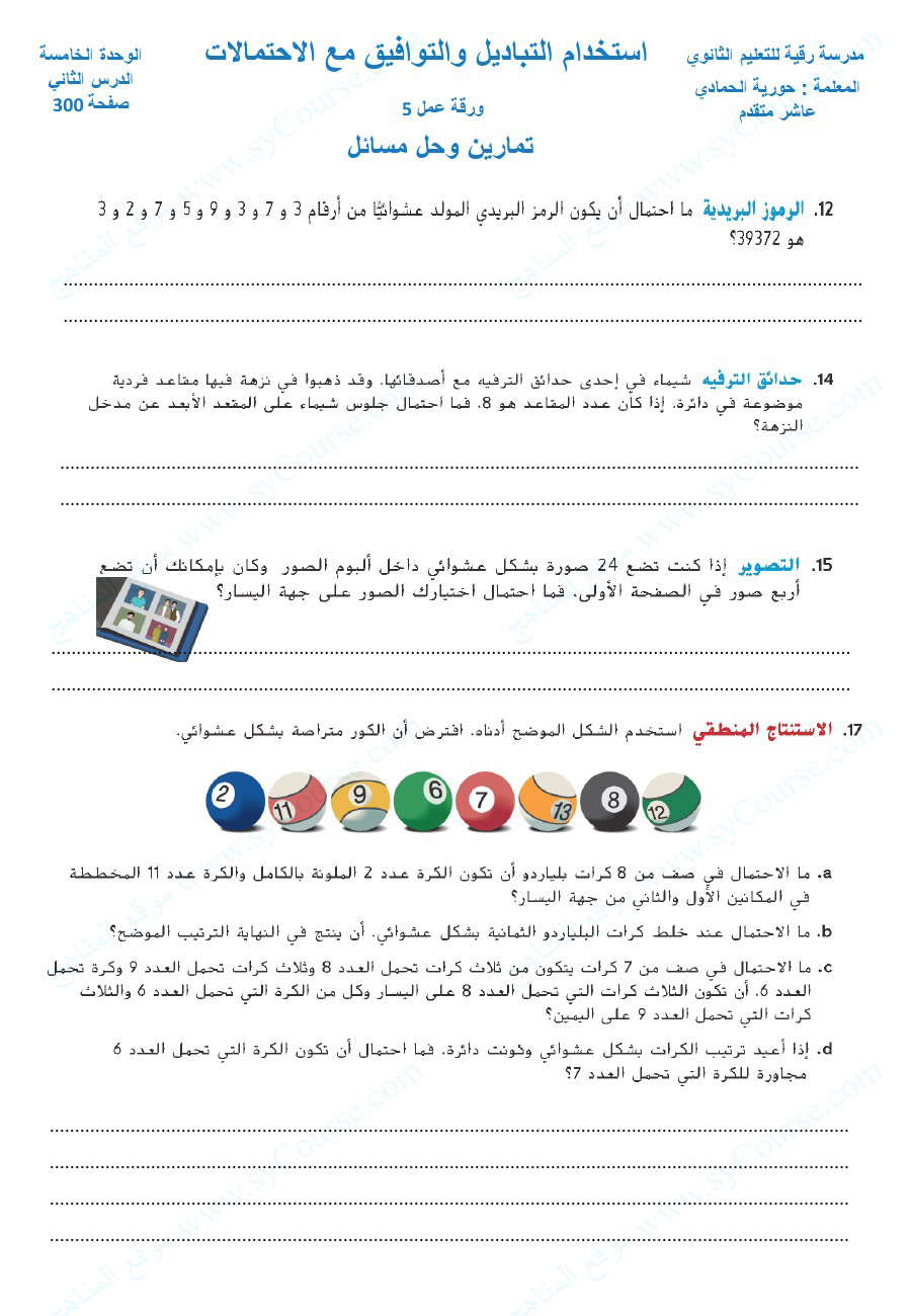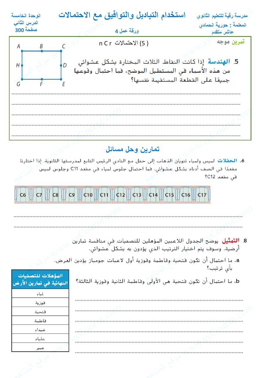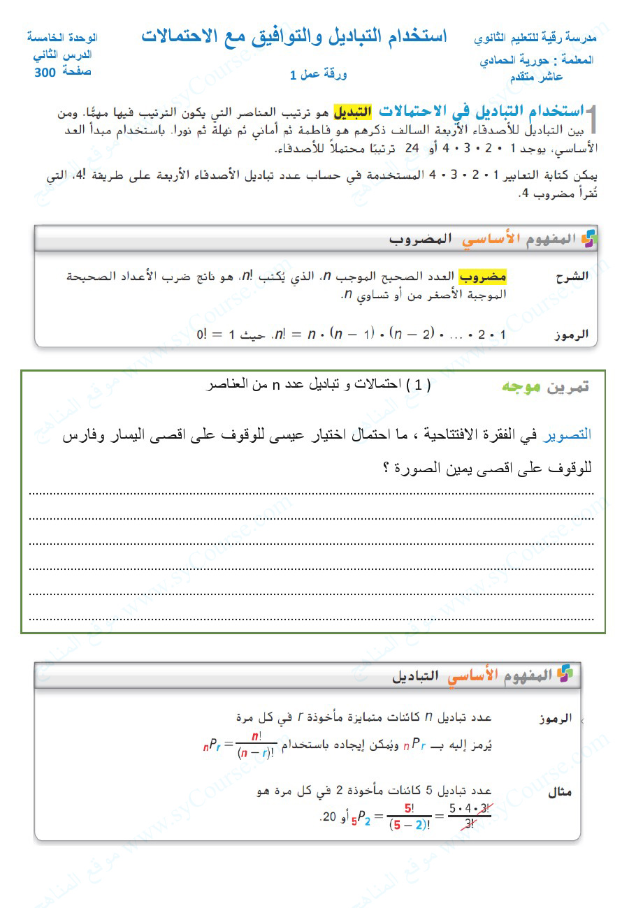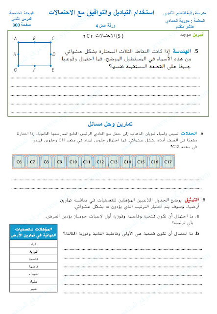 معلومات الملف: الصف العاشر المتقدم, الفصل الثاني, رياضيات, استخدام التباديل والتوافيق في الاحتمالات | ||