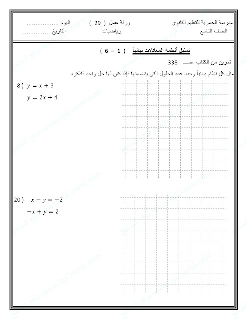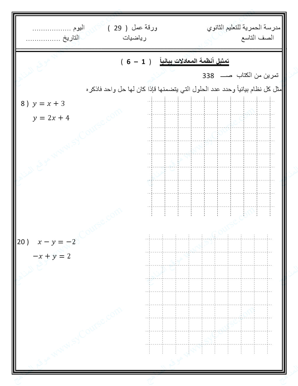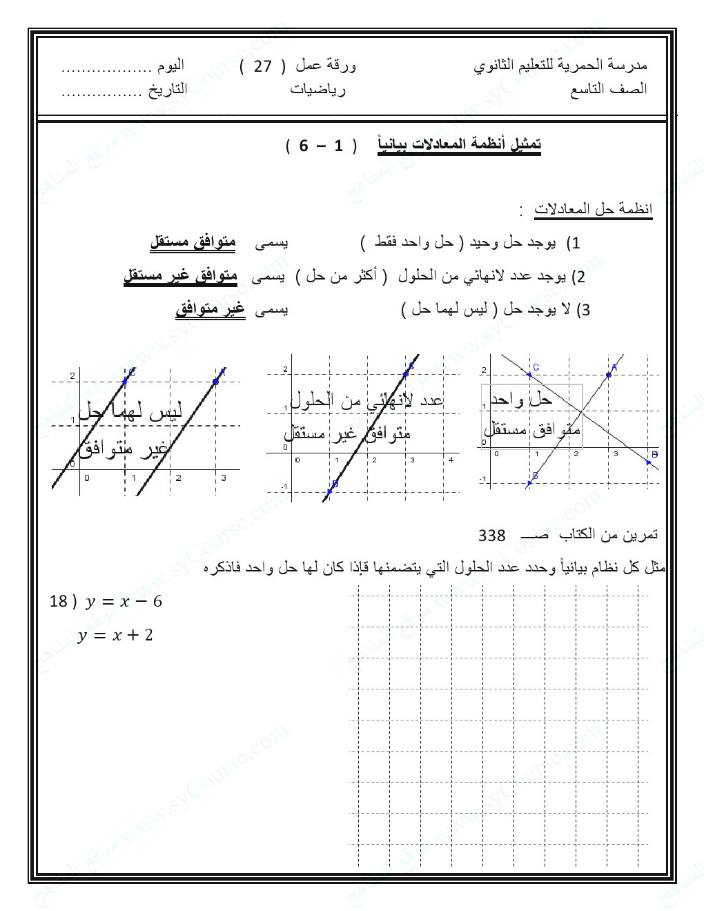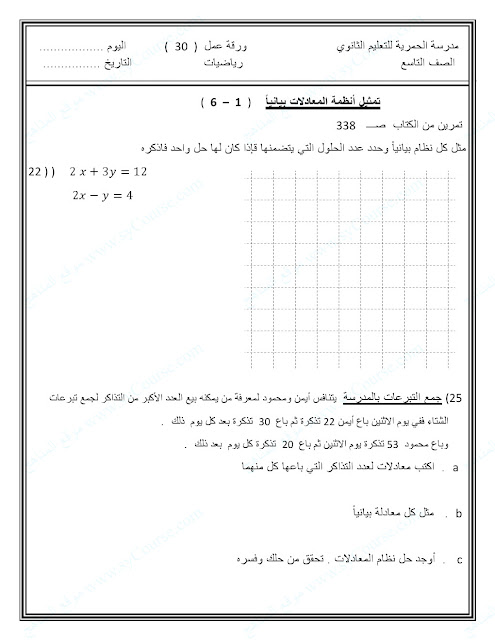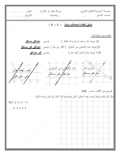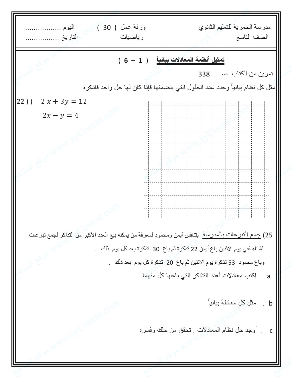 الصف التاسع, الفصل الثاني, رياضيات, أوراق عمل حول أنظمة المعادلات بيانياً لتحميل ملف أوراق العمل اتبع الرابط التالي: http://sycourse.com/up/do.php?id=367
