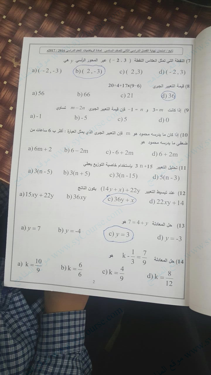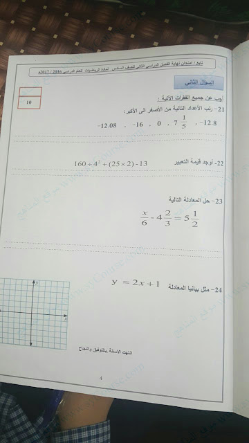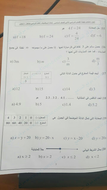 الصف السادس, الفصل الثاني, رياضيات, الامتحان الوزاري لنهاية الفصل الثاني من العام الدراسي 2016-2017