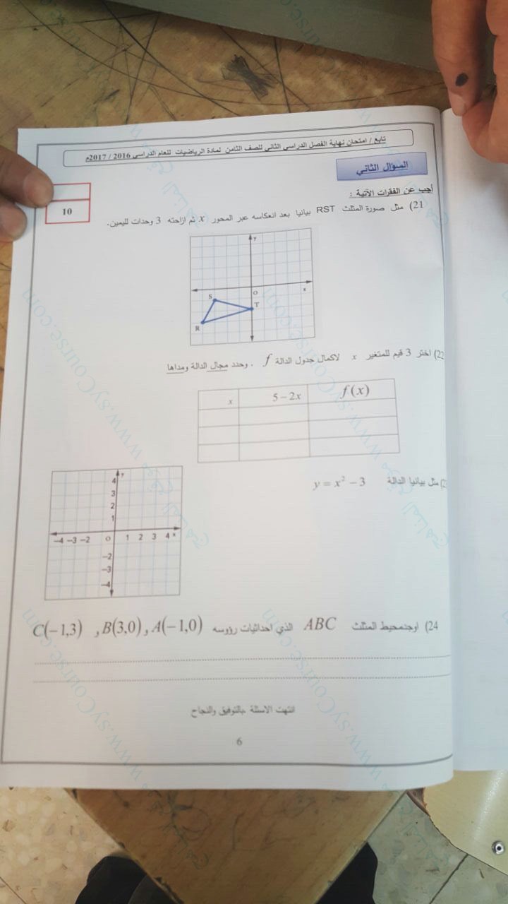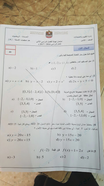 الصف الثامن, الفصل الثاني, رياضيات, الامتحان الوزاري لنهاية الفصل الثاني من العام الدراسي 2016-2017