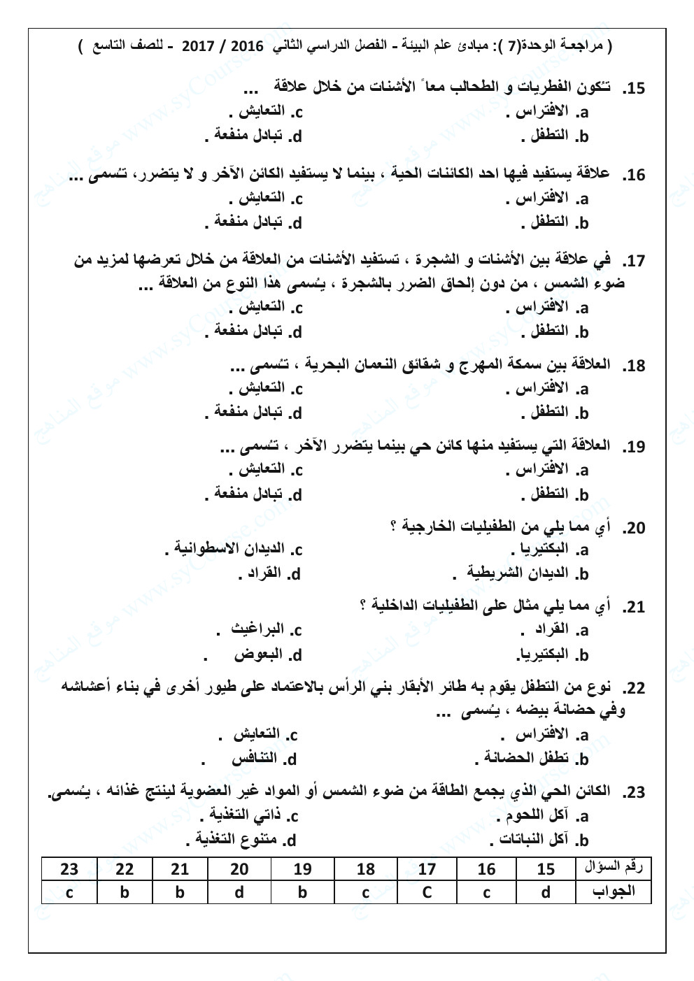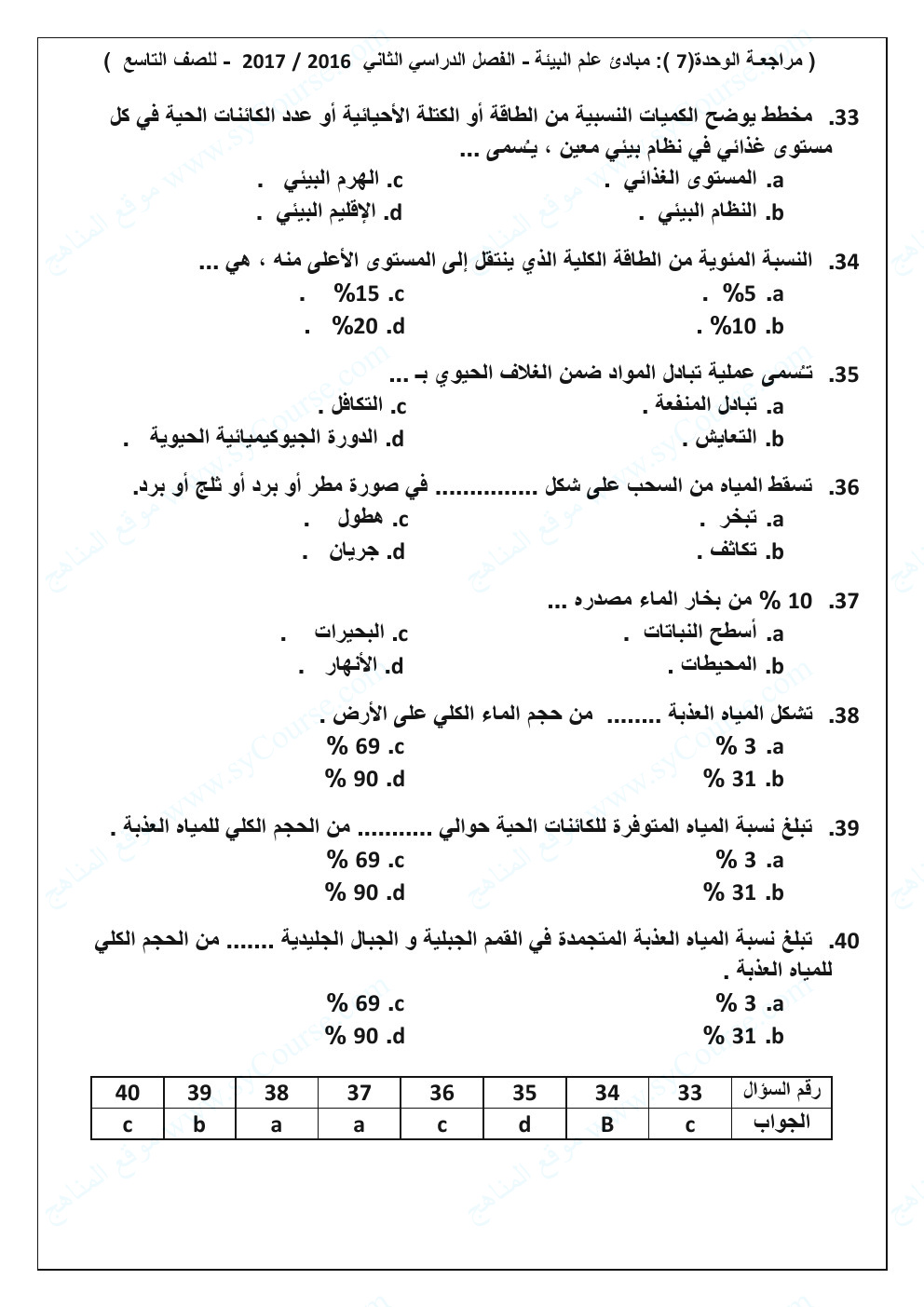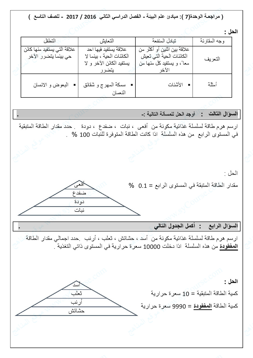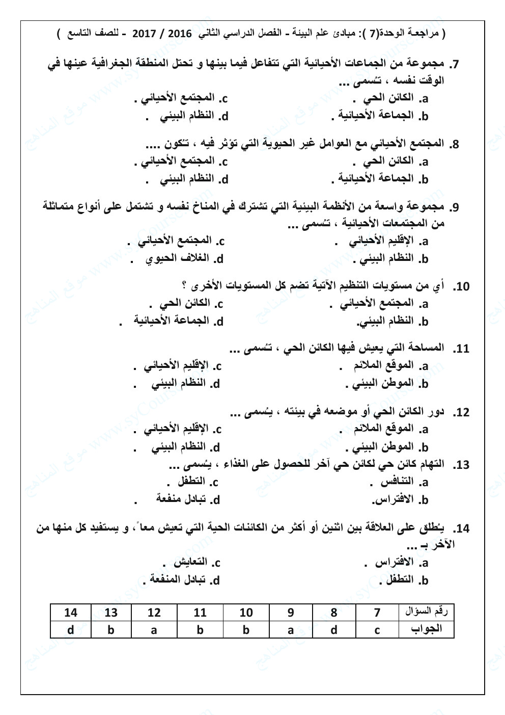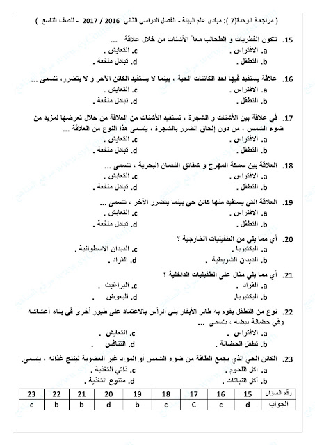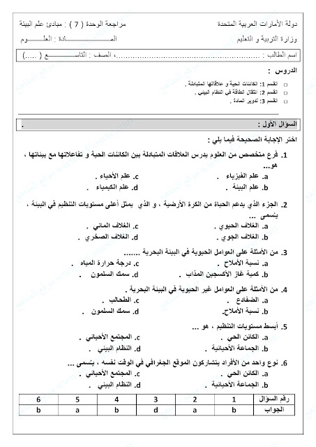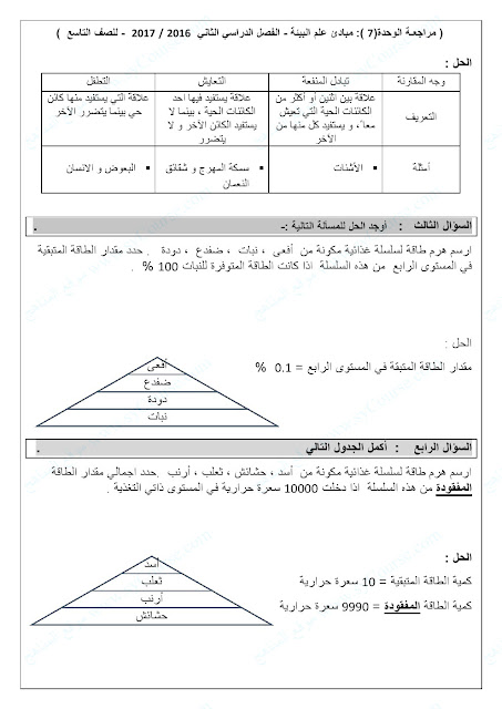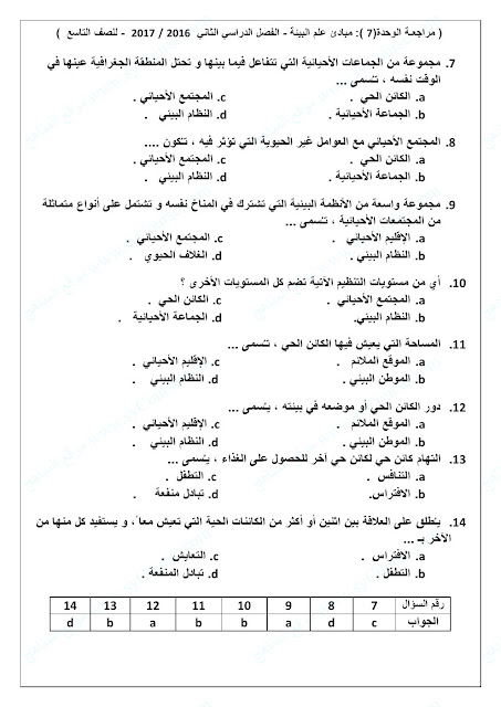 الصف التاسع, الفصل الثاني, علوم, نموذج تدريبي على الوحدة السابعة (مبادئ علم البيئة)