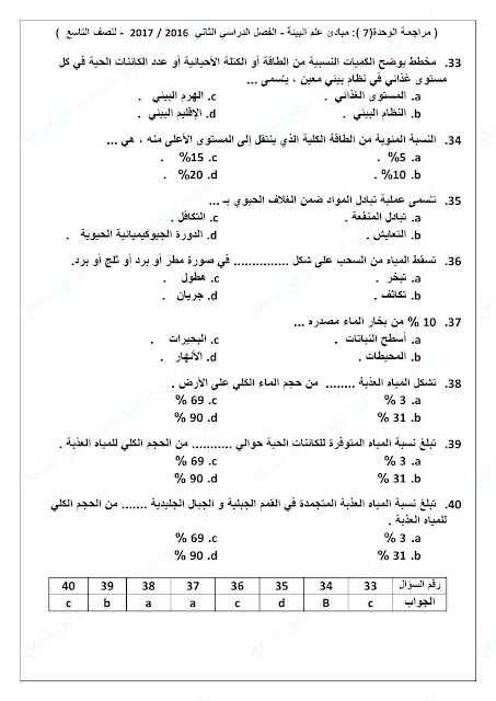 الصف التاسع, الفصل الثاني, علوم,نموذجتدريبي على الوحدة السابعة