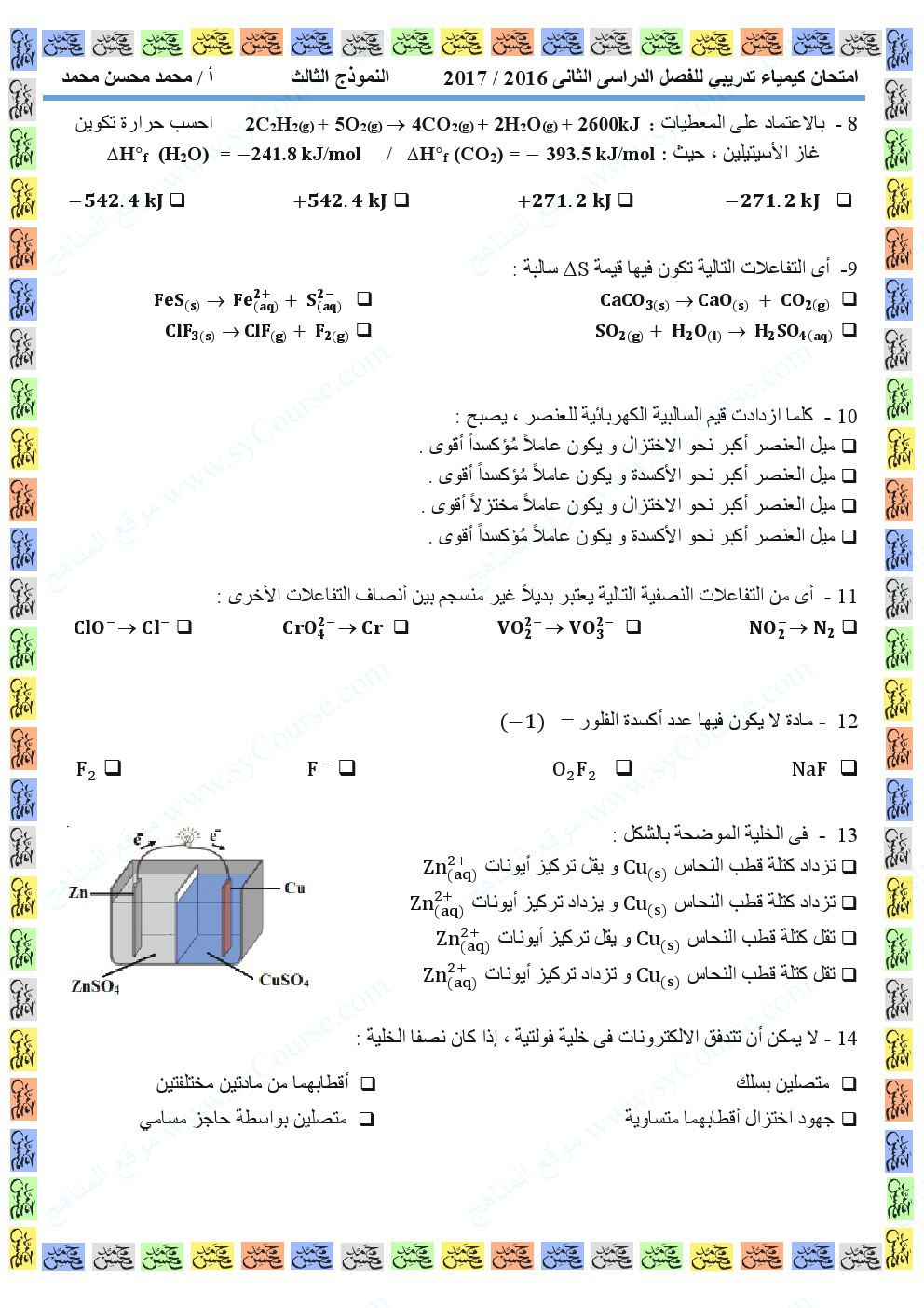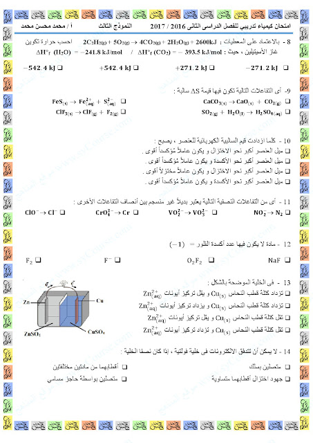 معلومات الملف: الصف الثاني عشر, الفصل الثاني, كيمياء,نموذجتدريبي لامتحان نهاية الفصل | ||