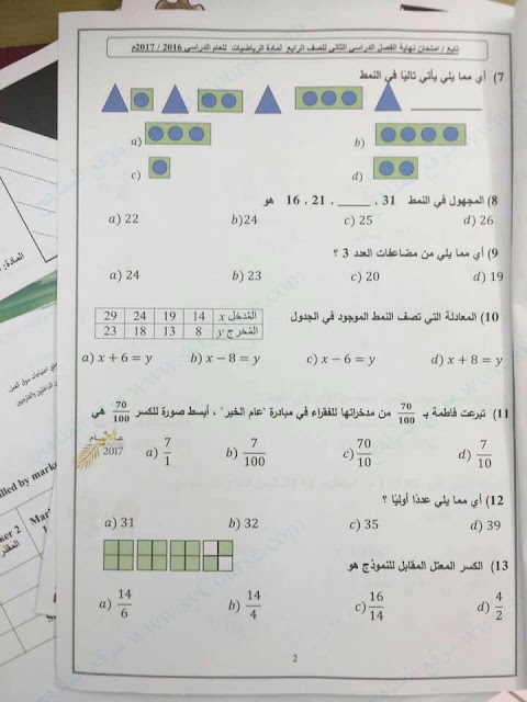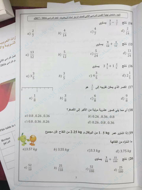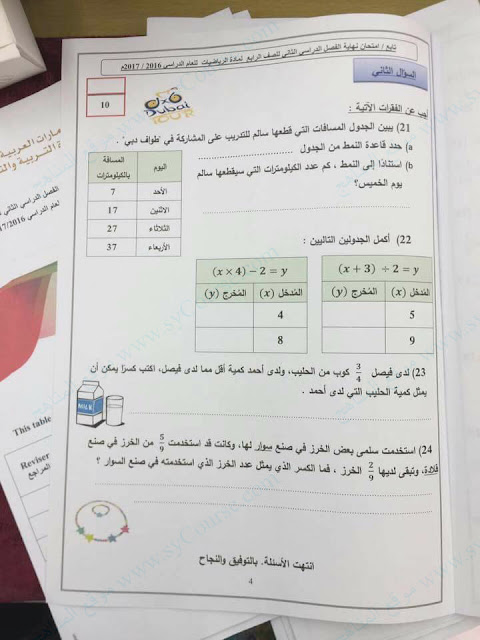 الصف الرابع, الفصل الثاني, رياضيات, الامتحان الوزاري لنهاية الفصل الثاني من العام الدراسي 2016-2017