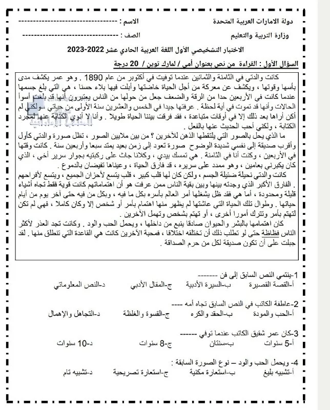 معلومات الملف: نرفق لكم ملف يتضمن أسئلة الاختبار التشخيصي الأول بدون الحل من مادة اللغة العربية للصف الحادي عشر الفصل الدراسي الأول للعام الدراسي 2023-2022 | ||