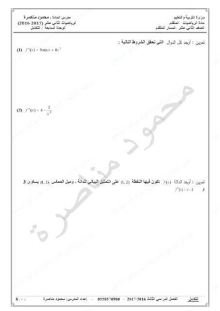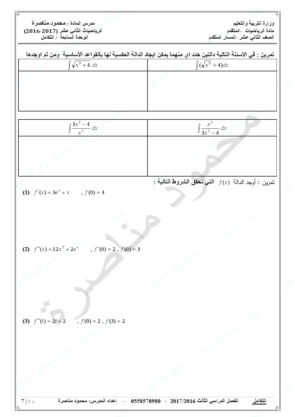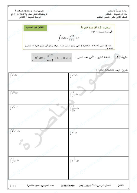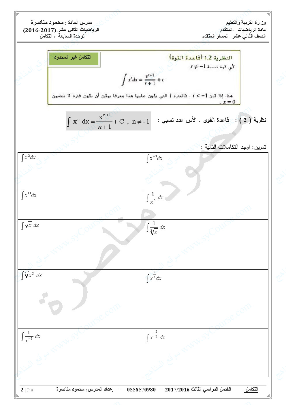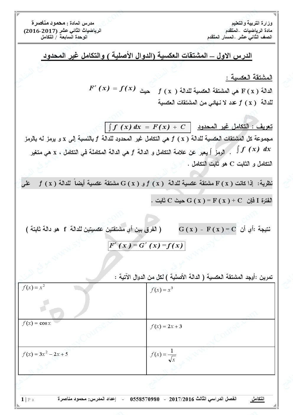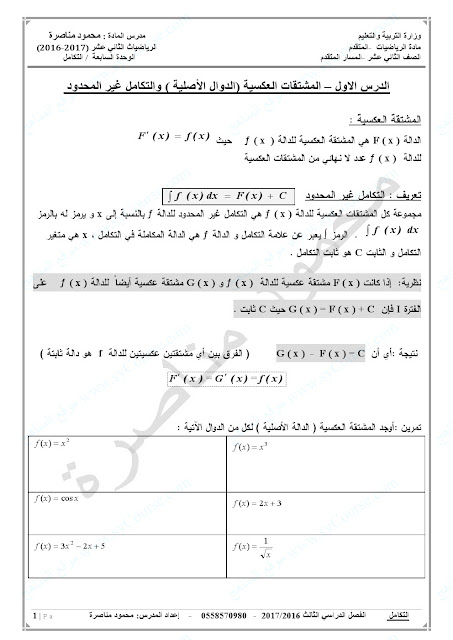 الدرس الأول المشتقات العكسية والتكامل غير المحدود. | |||