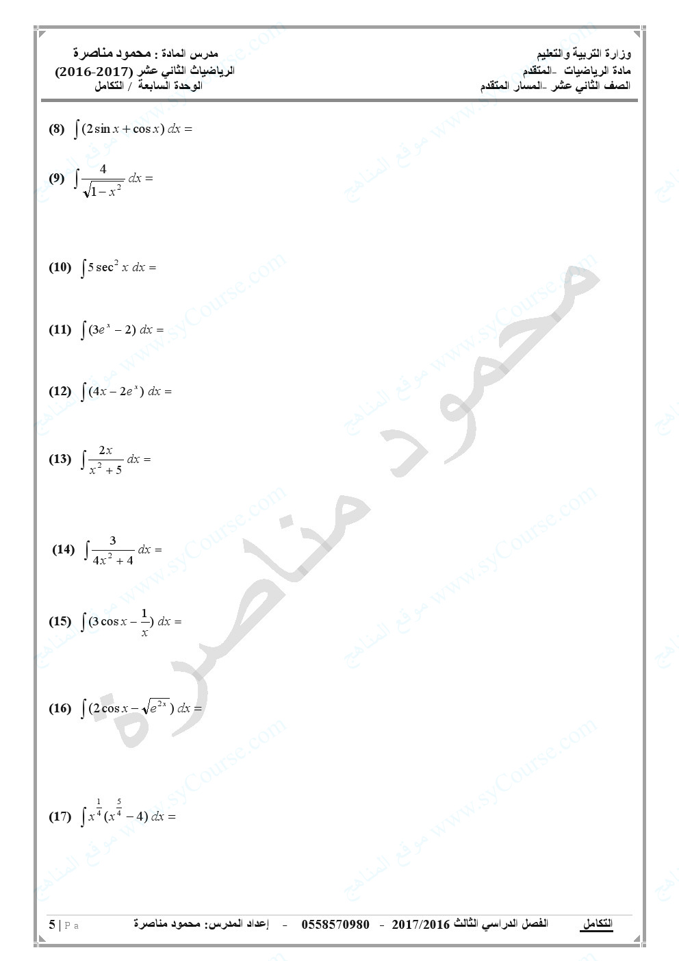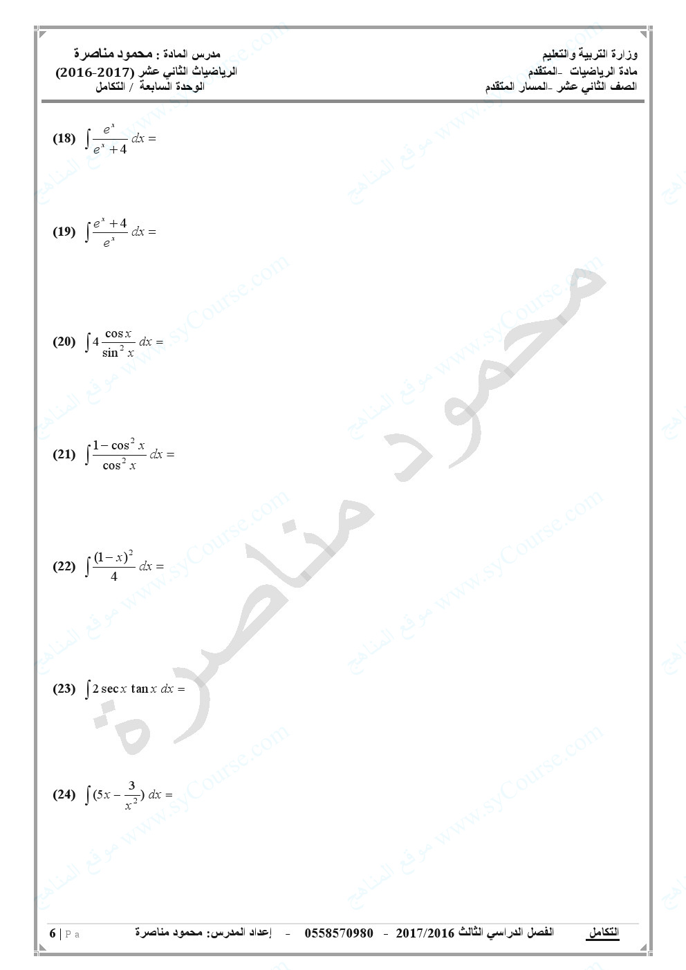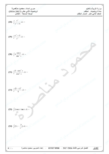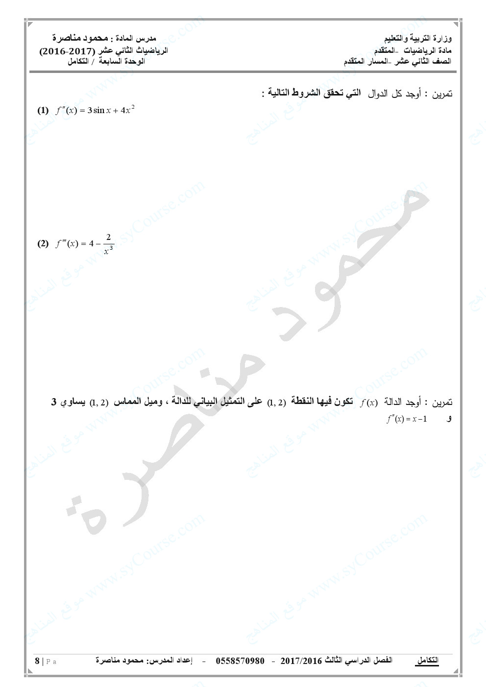 معلومات الملف: الصف الثاني عشر المتقدم, الفصل الثالث, رياضيات, الدرس الأول - المشتقات العكسية والتكامل غير المحدود. | |||