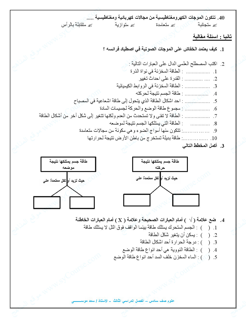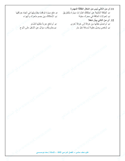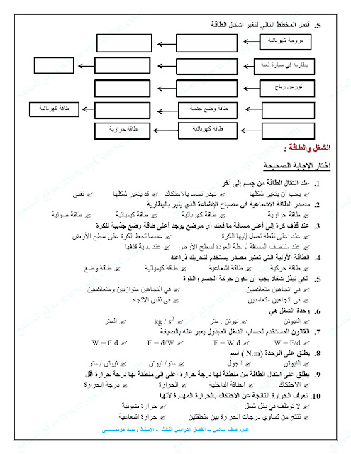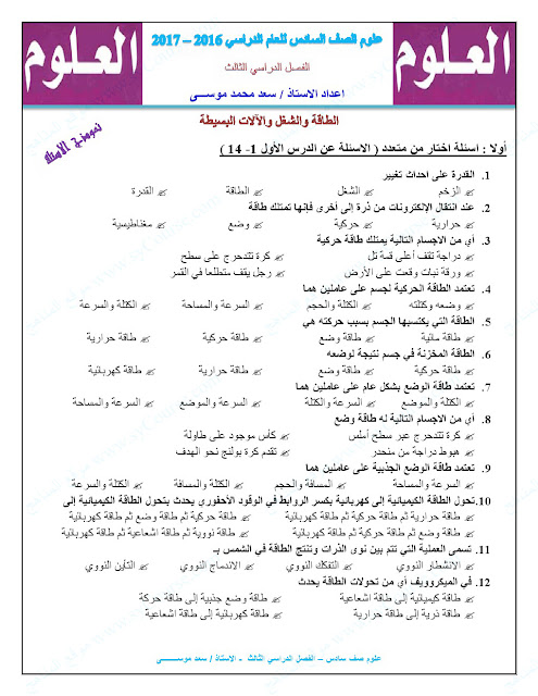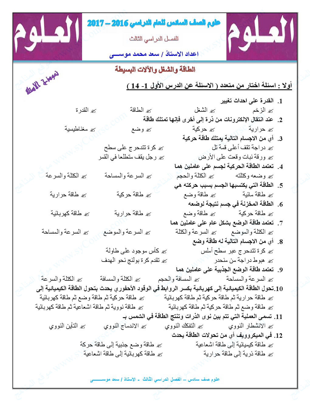 معلومات الملف: الصف السادس, الفصل الثالث, علوم,نموذجامتحاني للطاقة والشغل والالات | |||