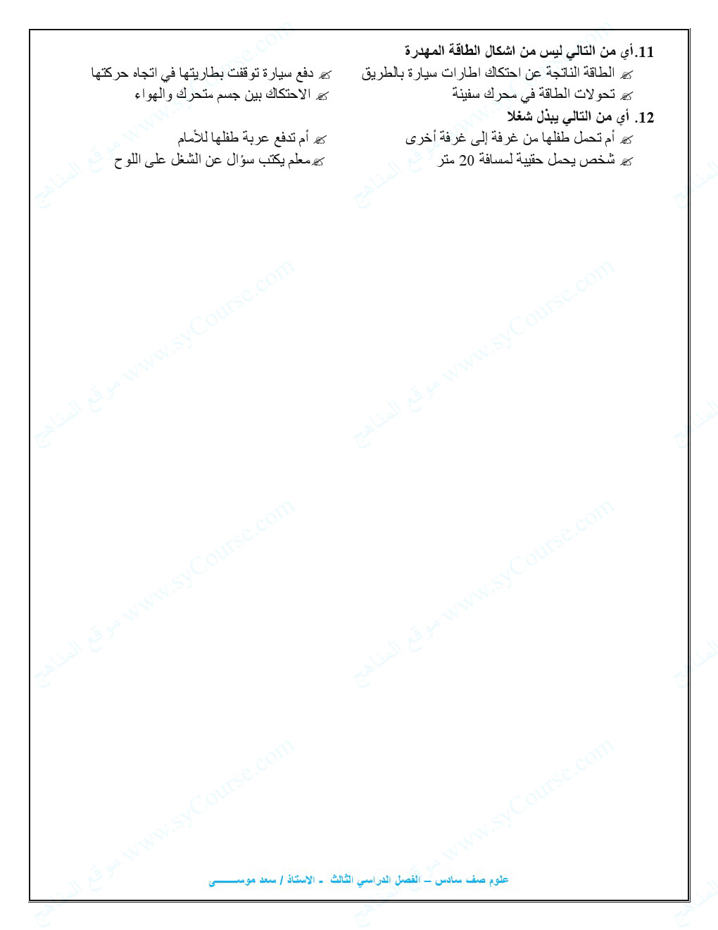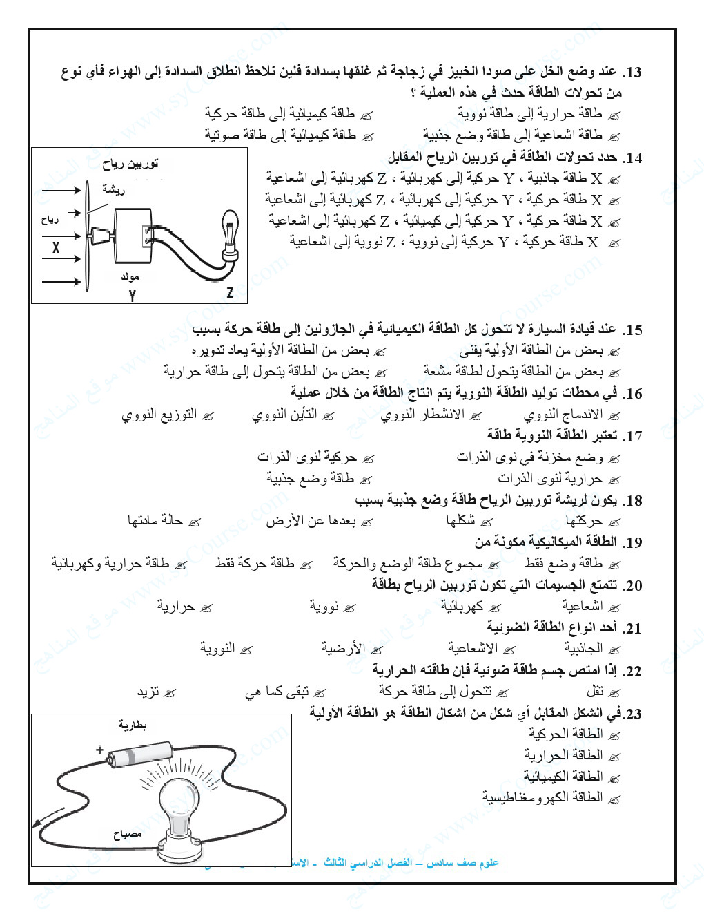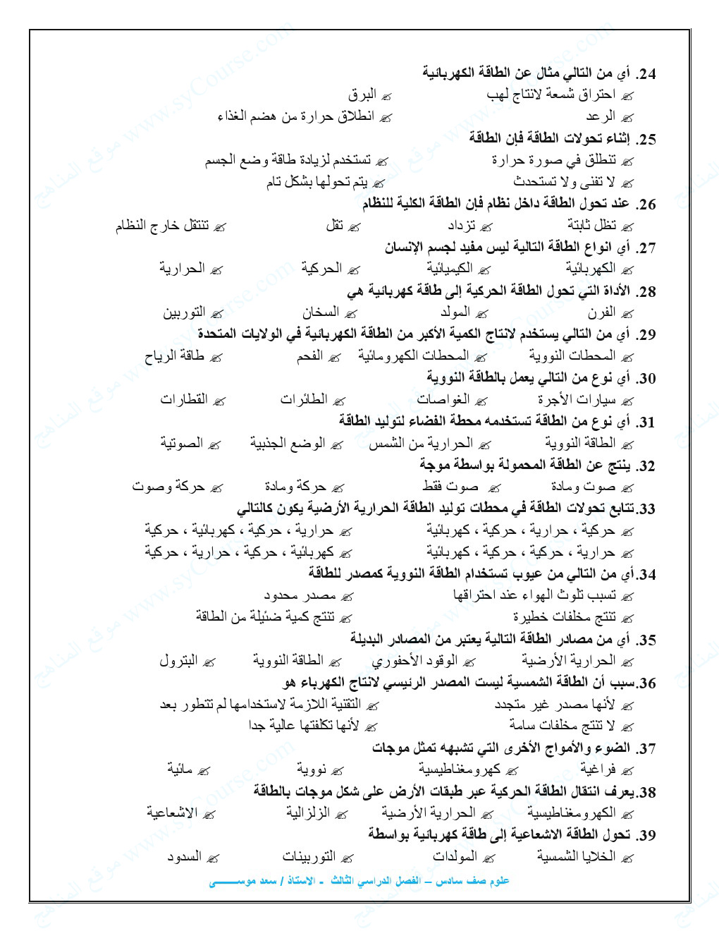 معلومات الملف: الصف السادس, الفصل الثالث, علوم,نموذجامتحاني للطاقة والشغل والالات | |||