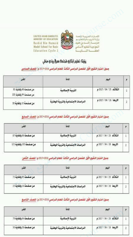 جدول اختبار التقويم الأول للفصل الثالث من العام الدراسي 2016-2017 للصفوف من السادس وحتى التاسع
