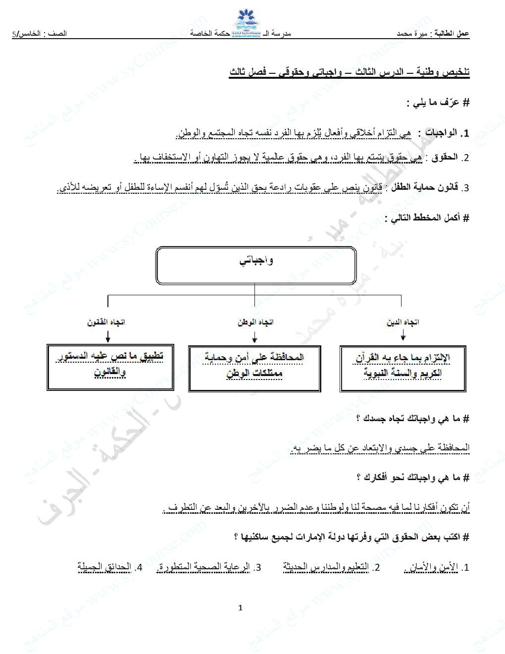 معلومات الملف: الصف الخامس, الفصل الثالث, اجتماعيات, أوراق عمل الدرس الثالث مع الحل (واجباتي وحقوقي). | |||