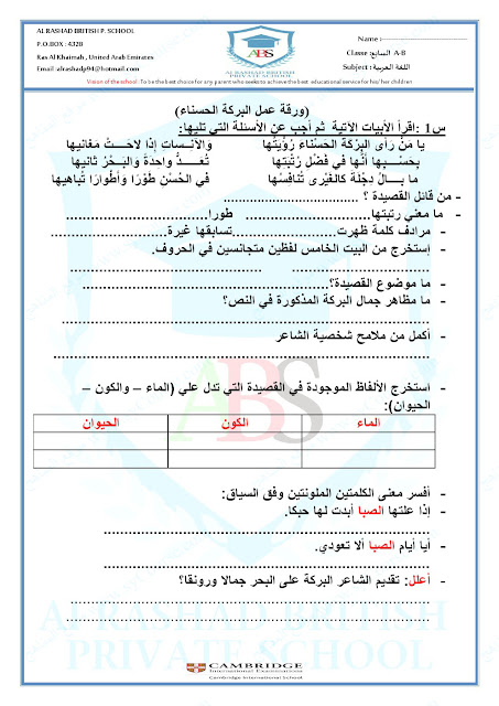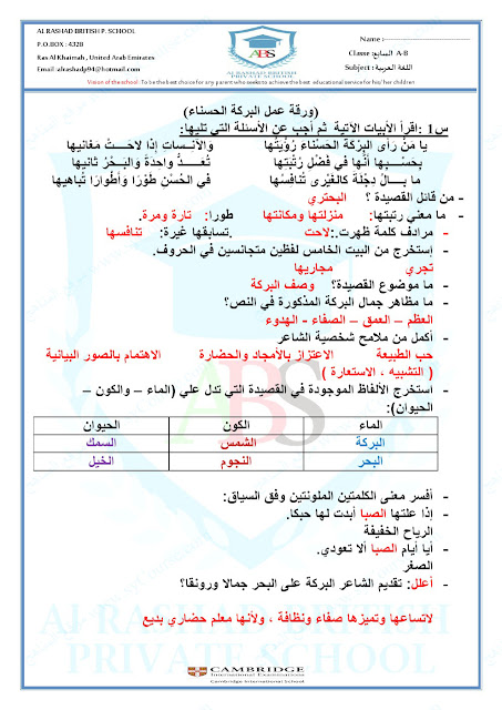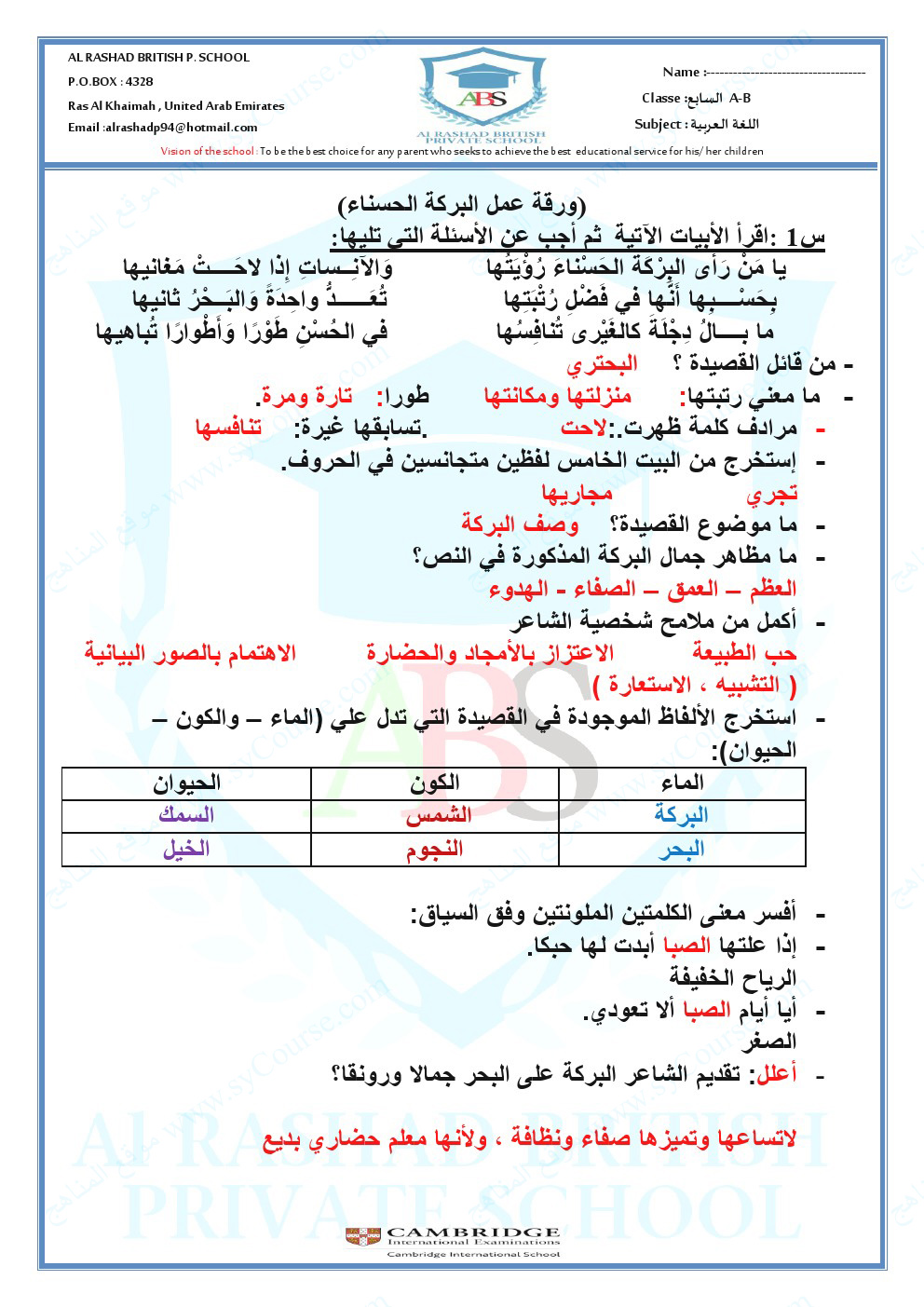 | معلومات الملف: الصف السابع, الفصل الثالث, لغة عربية, ورقة عمل البركة الحسناء | |||