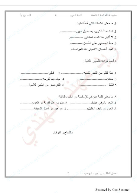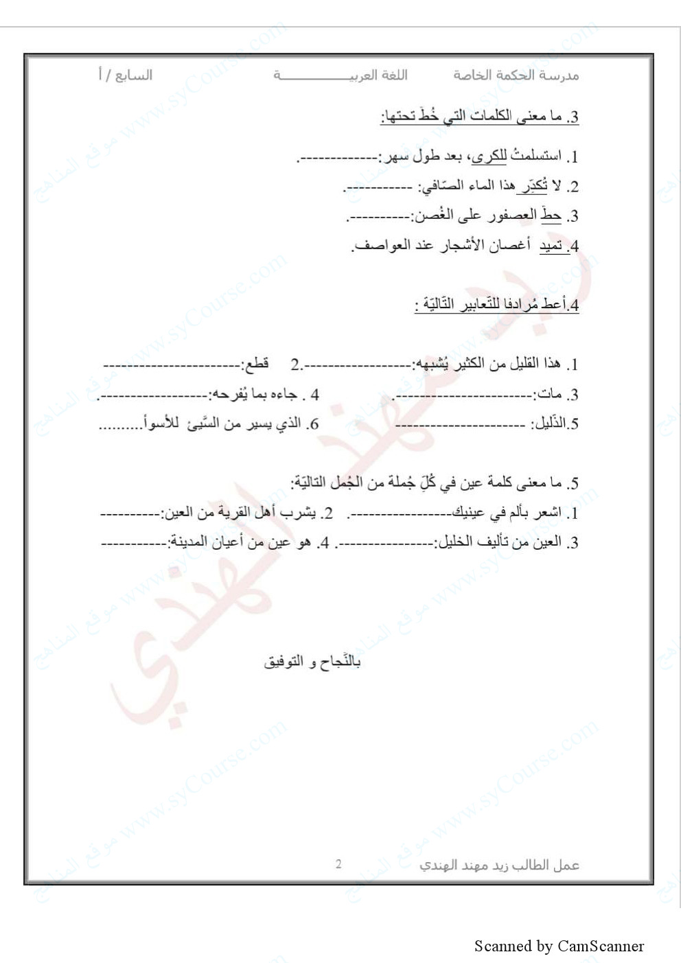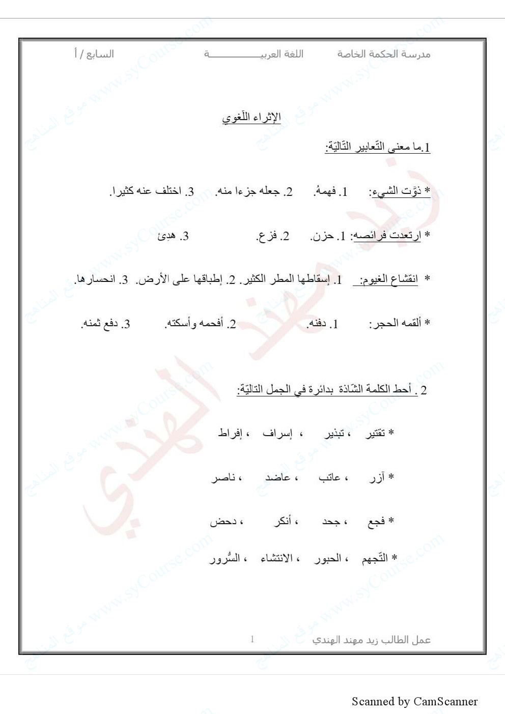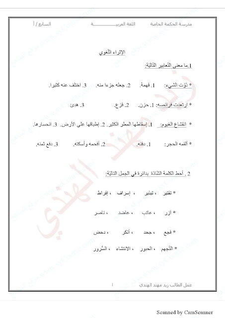 الصف السابع, الفصل الثالث, لغة عربية, اثراء لغوي وهذا الاثراء مكون من صفحتين من اعداد أحد الطالب: زيد الهندي