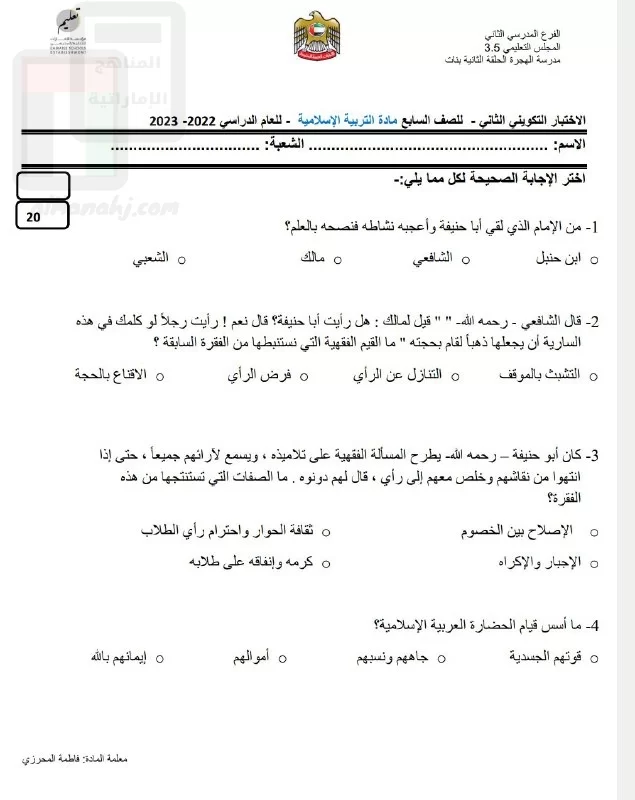 معلومات الملف: نرفق لكم ملف يتضمن أسئلة الاختبار التكويني الثانينموذجثاني بدون الحل من مادة التربية الاسلامية للصف السابع الفصل الدراسي الثاني للعام الدراسي 2023-2022 | ||