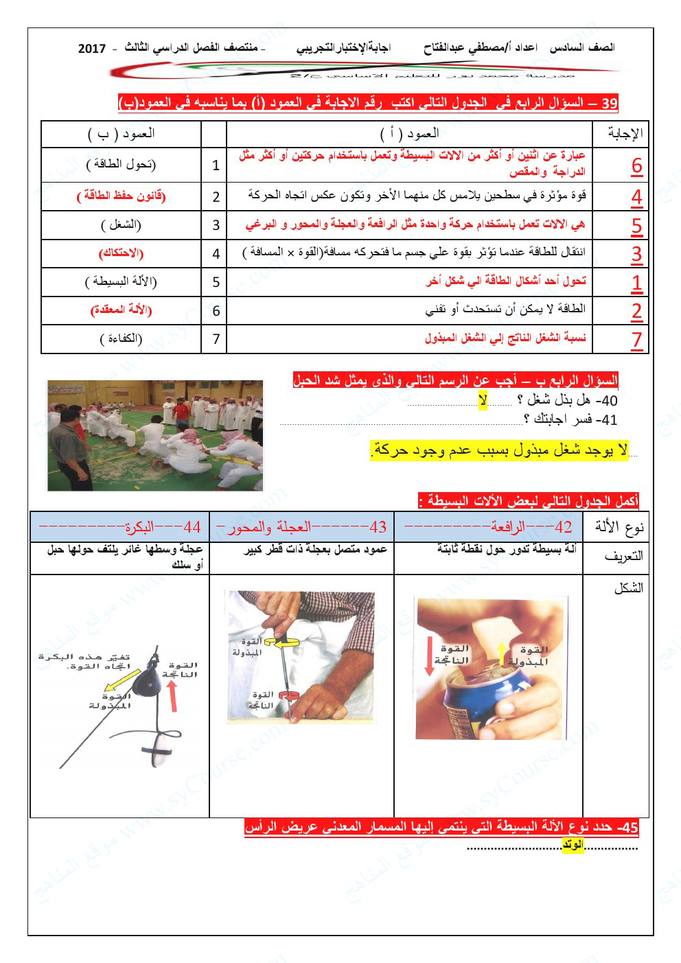 الصف السادس, الفصل الثالث, علوم, نموذج اجابة لأسئلة لمنتصف الفصل الثالث