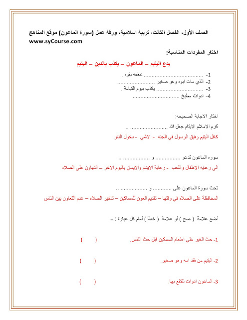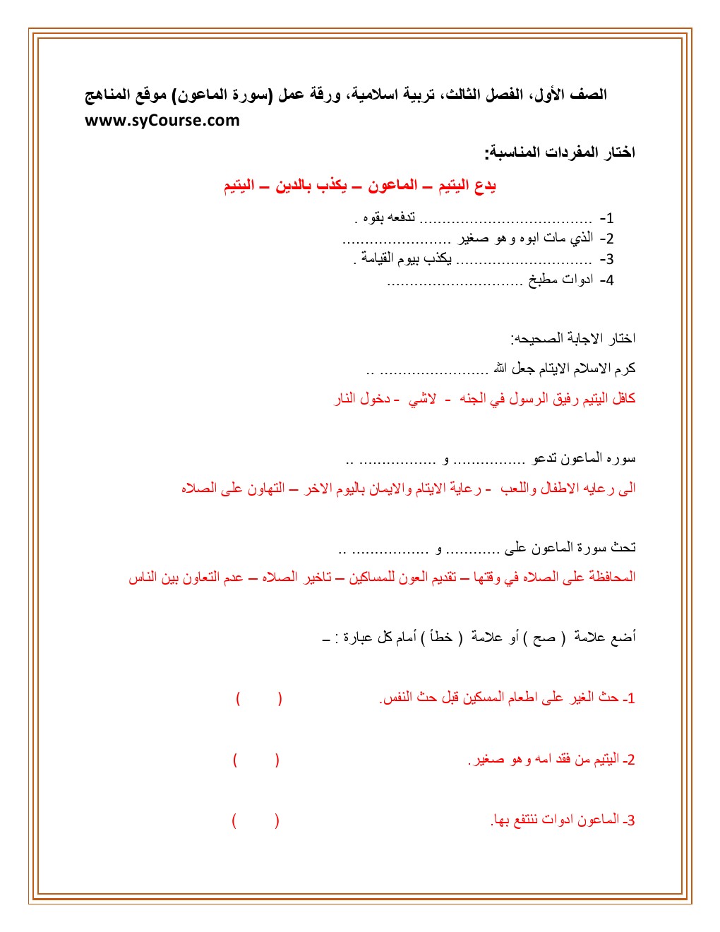 معلومات الملف: الصف الأول, الفصل الثالث, تربية اسلامية, ورقة عمل (سورة الماعون) | ||