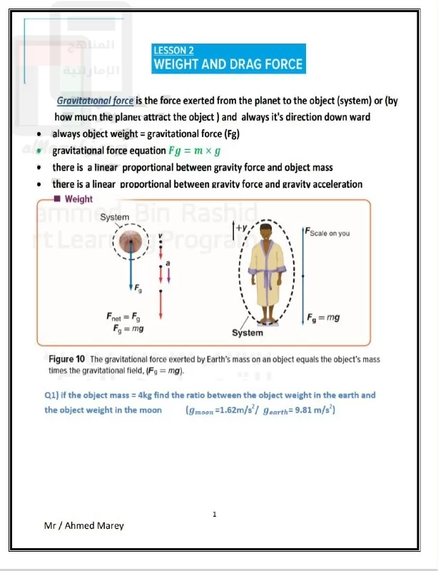 ملخص ومراجعة الدرس الثاني Weight and Drag Force الوزن وقوة السحب - إعداد: Ahmed Marey