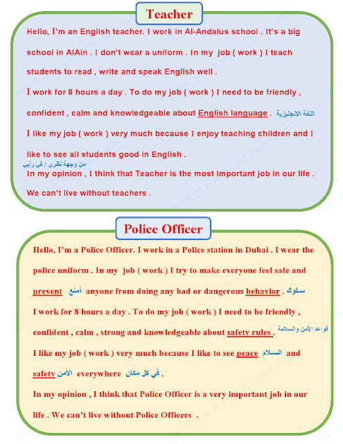 الصف السادس, الفصل الثالث, لغة انكليزية, طريقة كتابة المواضيع+ مواضيع حول Doctor +Teacher+ Police Officer+ Car mechanic وذلك وفق المنهاج الاماراتي