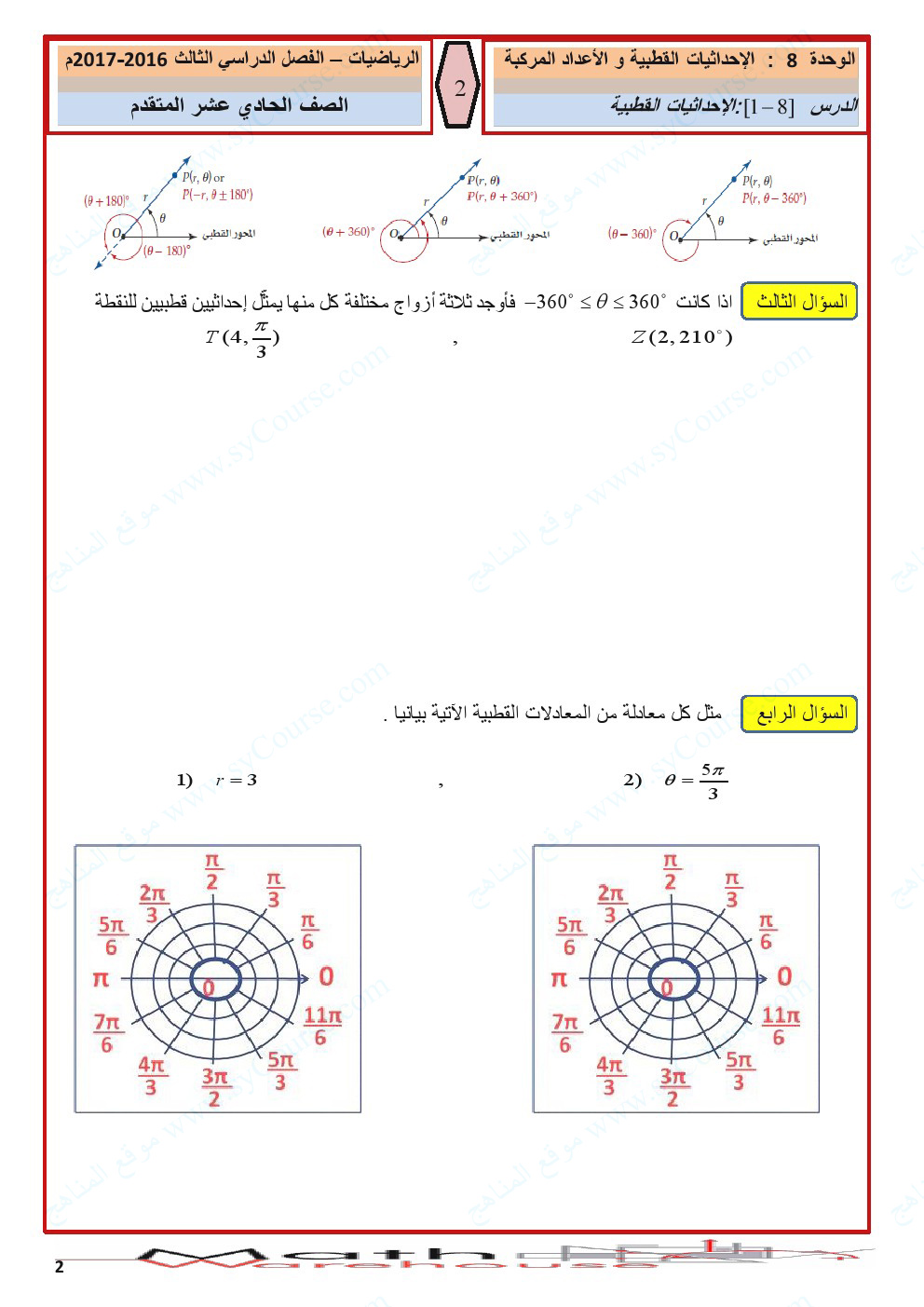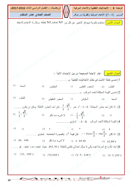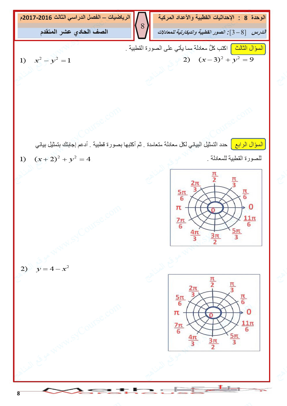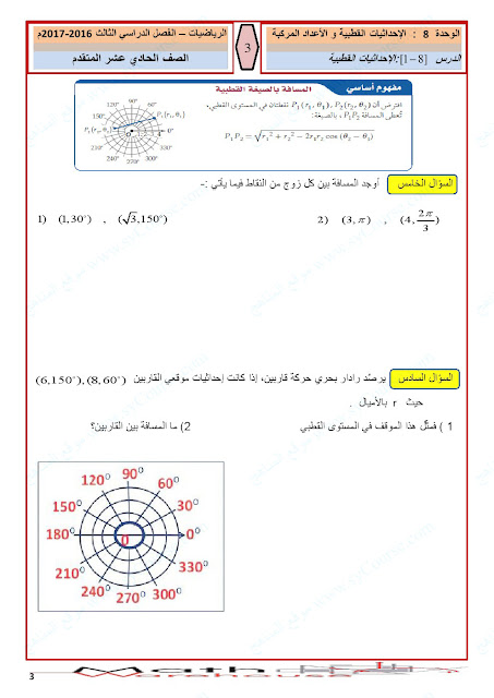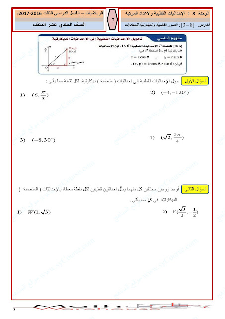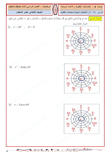 الصف الحادي عشر المتقدم, الفصل الثالث, رياضيات, أوراق عمل الاحداثيات القطبية والأعداد المركبة لرؤية الصورة بالحجم الكامل: اضغط عليها.