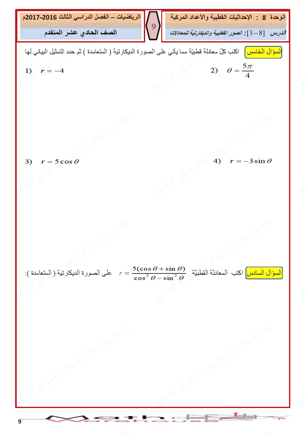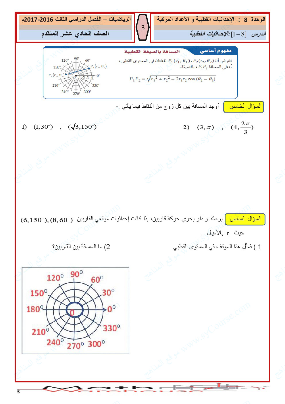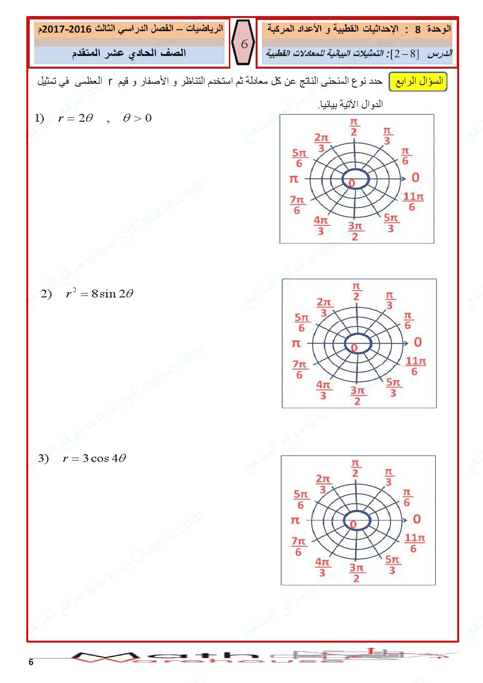 الصف الحادي عشر المتقدم, الفصل الثالث, رياضيات, أوراق عمل الاحداثيات القطبية والأعداد المركبة لرؤية الصورة بالحجم الكامل: اضغط عليها.