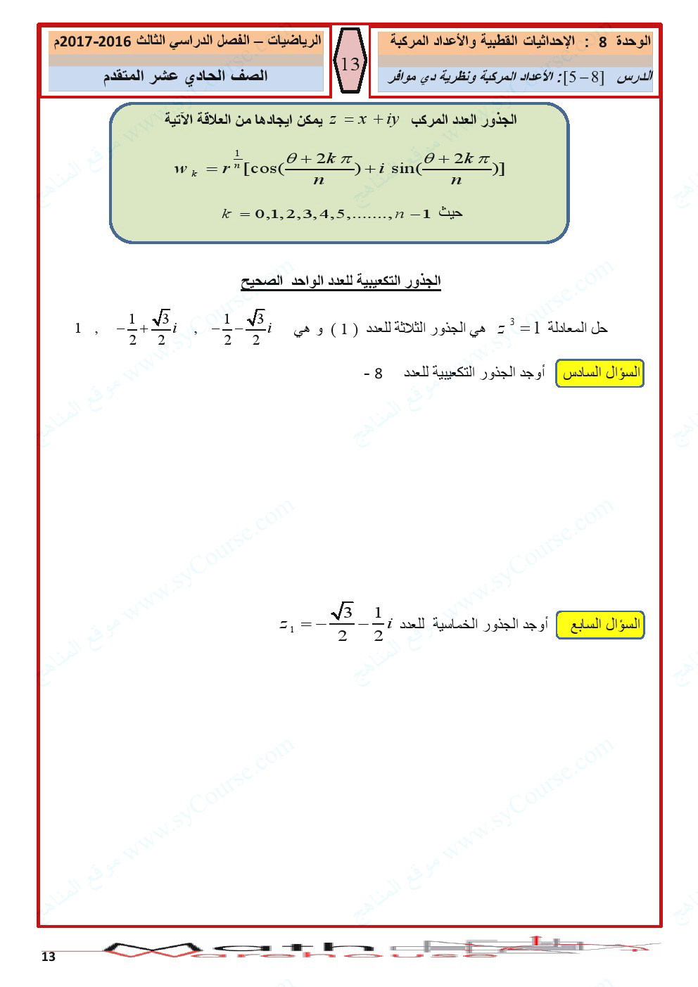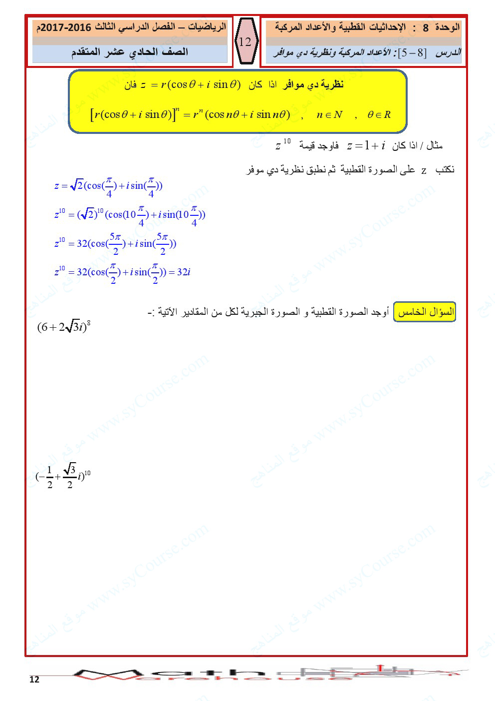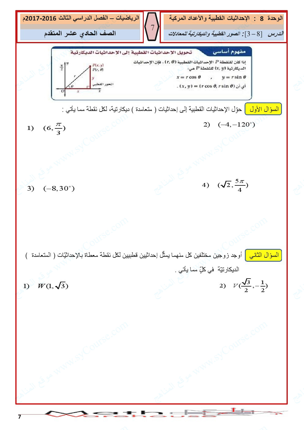 معلومات الملف: الصف الحادي عشر المتقدم, الفصل الثالث, رياضيات, أوراق عمل الاحداثيات القطبية والأعداد المركبة | ||