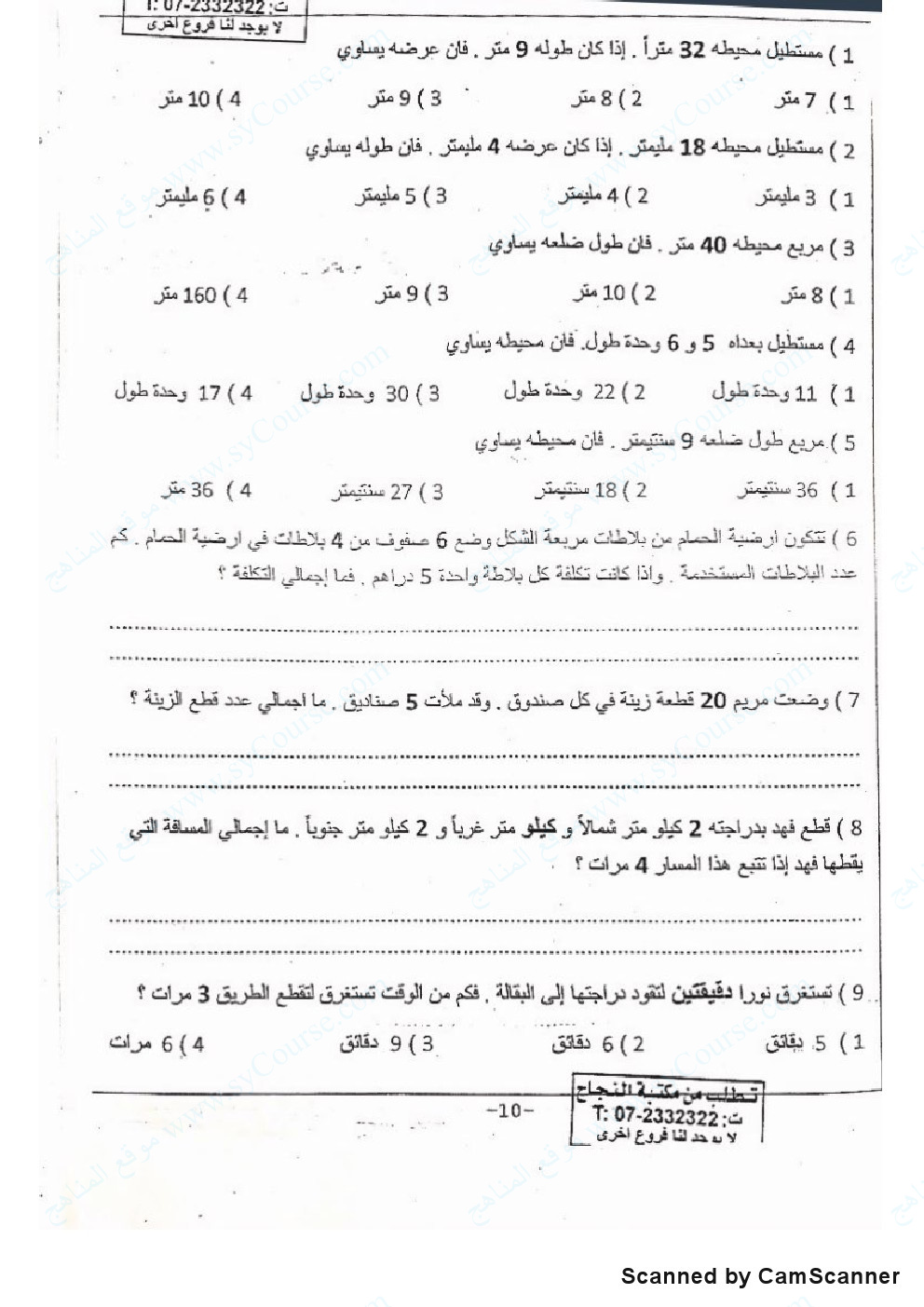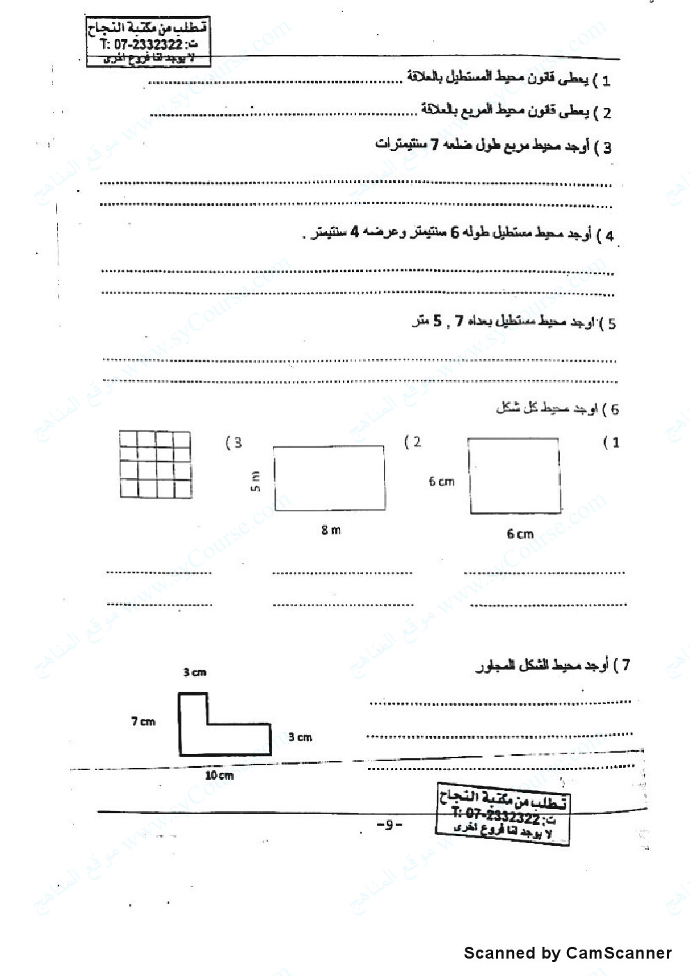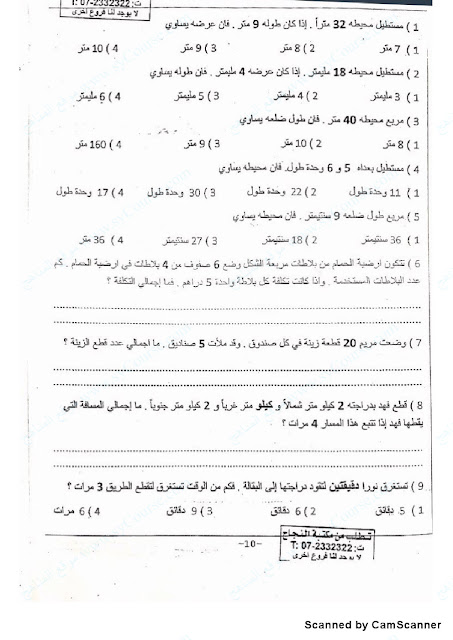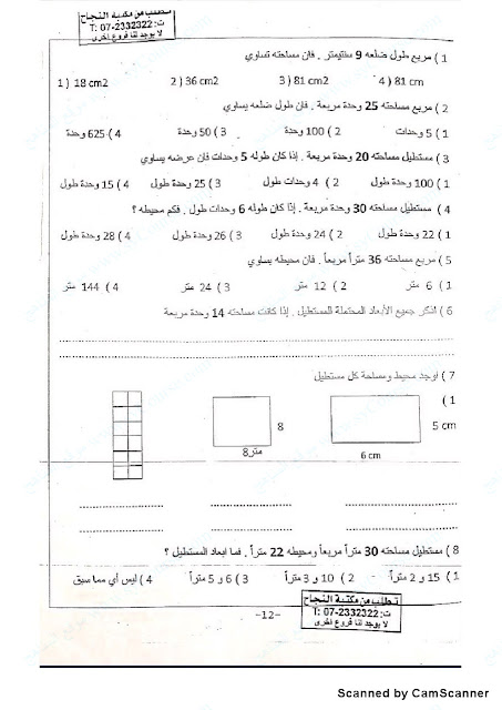 الصف الرابع, الفصل الثالث, رياضيات, تدريبات على وحدة المحيط والمساحة وذلك تحضيراً لامتحان منتصف الفصل الثالث من العام الدراسي 2016-2017 وفق المنهاج الاماراتي