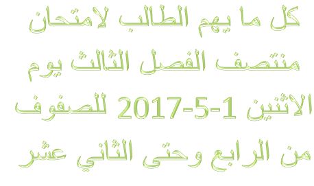 كل ما يهم الطالب لامتحان الغد الاثنين 152017للصفوف من الرابع وحتى الثاني | ||