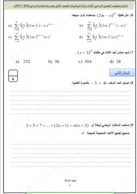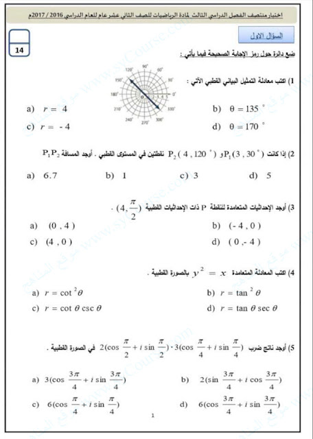 معلومات الملف: الصف الثاني عشر العام, الفصل الثالث, رياضيات, اختبار منتصف الفصل الدراسي الثالث لمادة الرياضيات للصف الثاني عشر عام للعام الدراسي 2016-2017 | |||