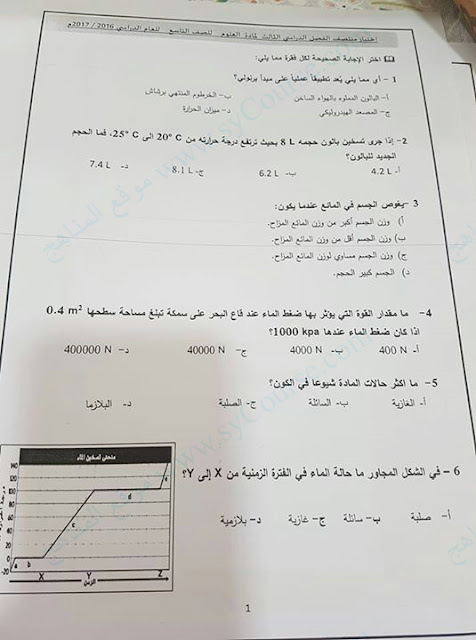 الصف التاسع, الفصل الثالث, علوم, الاختبار الوزاري لمنتصف الفصل الثلاث