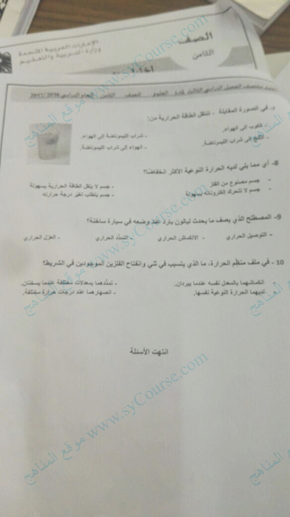 الاختبار الوزاري لمنتصف الفصل الثالث في العلوم للصف الثامن -العام الدراسي 2016-2017 |