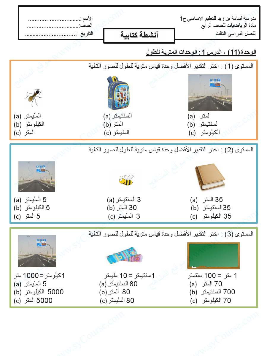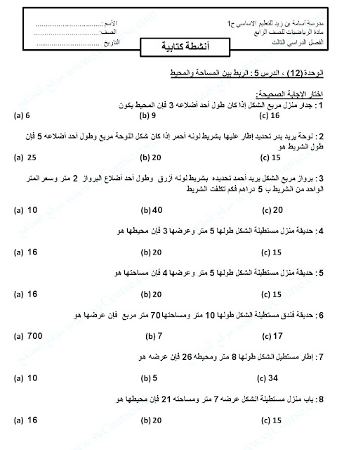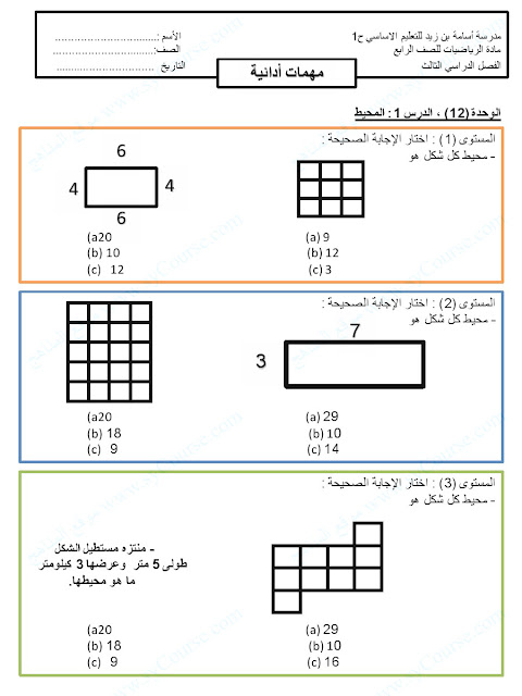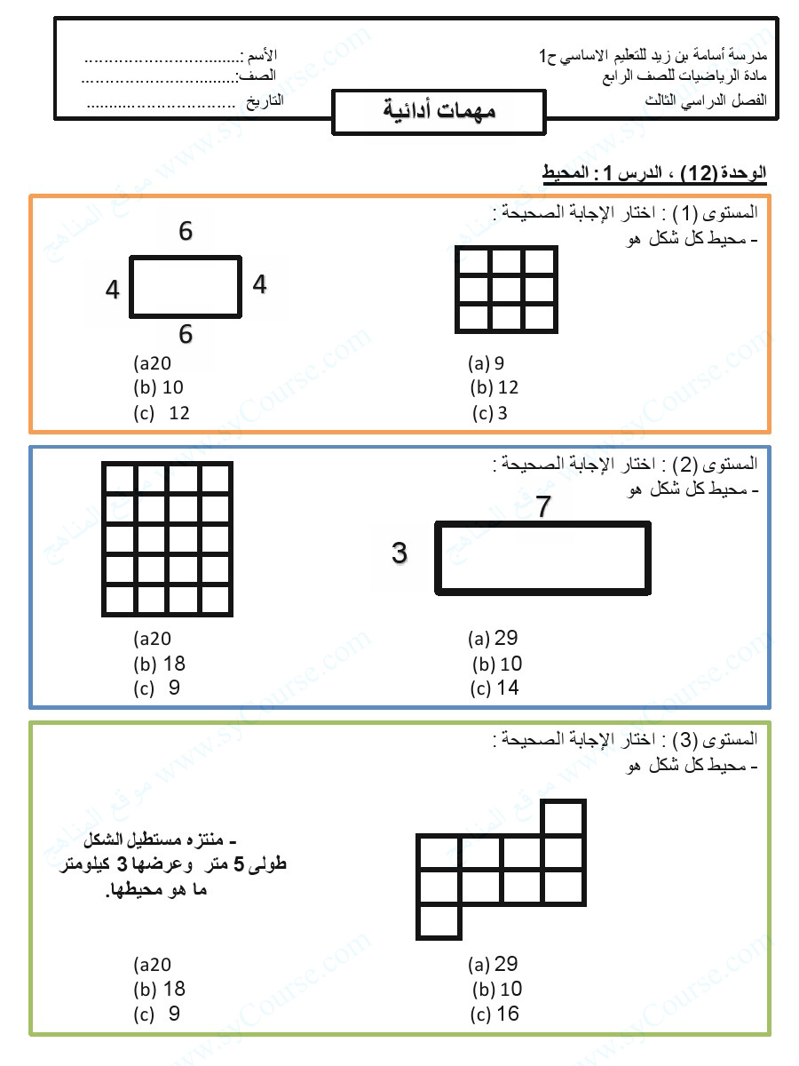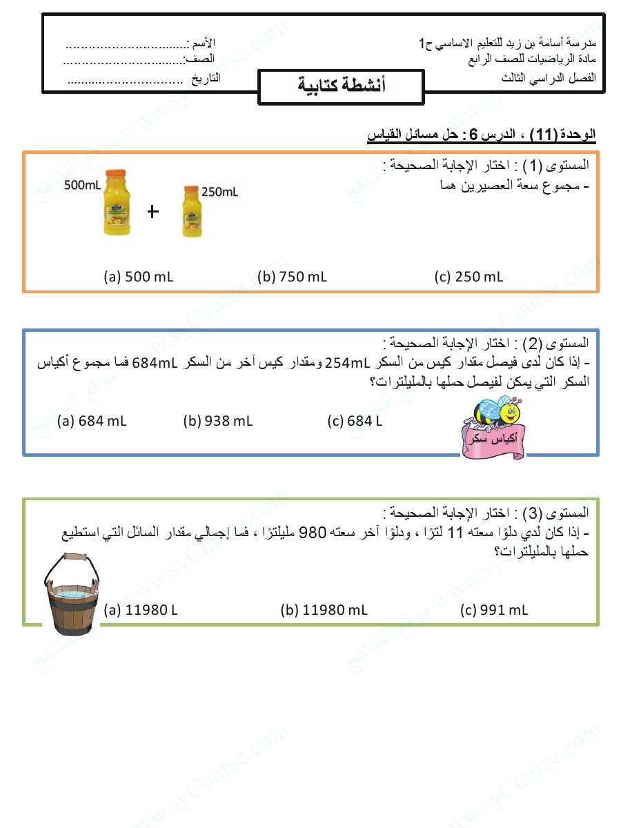 الصف الرابع, الفصل الثالث, رياضيات, أوراق عمل الوحدتين ال11 وال12 |