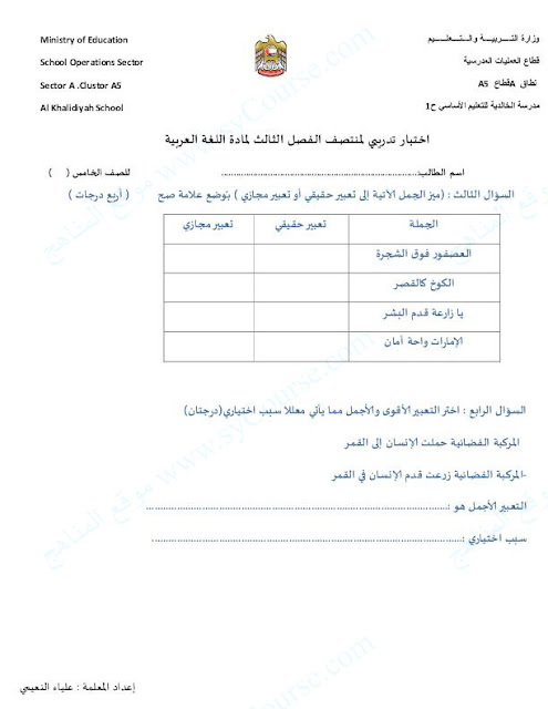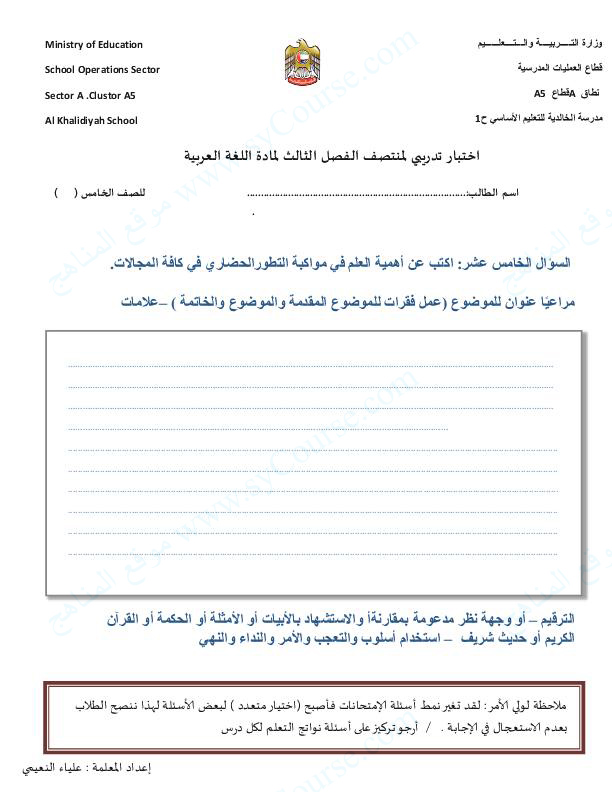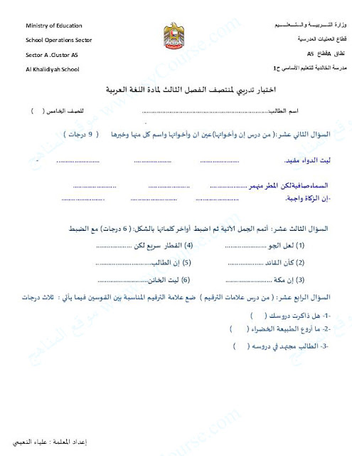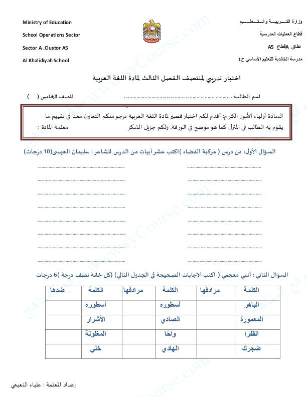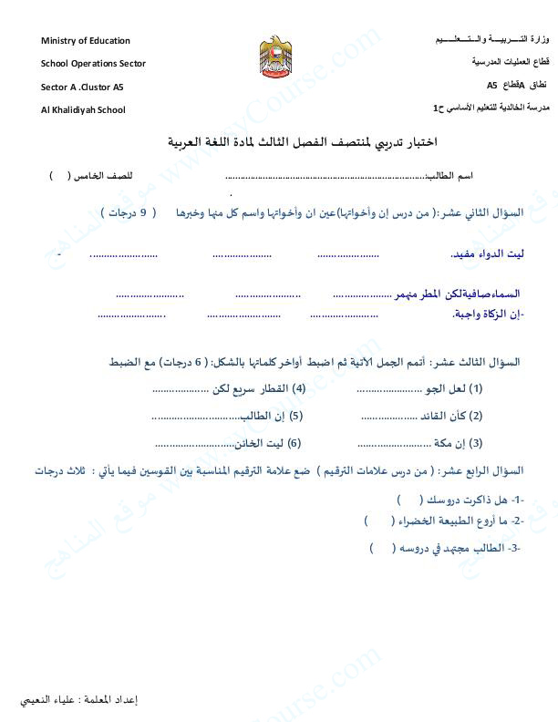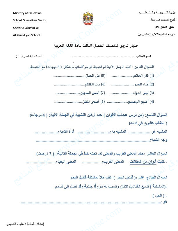 معلومات الملف: الصف الخامس, الفصل الثالث, لغة عربية, اختبار تدريبي | ||