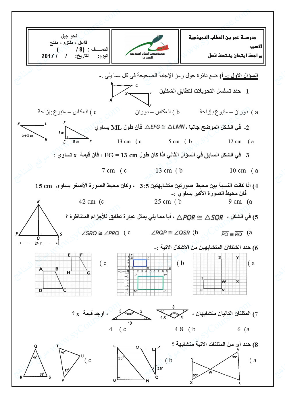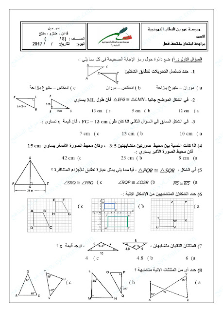 الصف الثامن, الفصل الثالث, رياضيات, مراجعة لامتحان منتصف الفصل الثالث