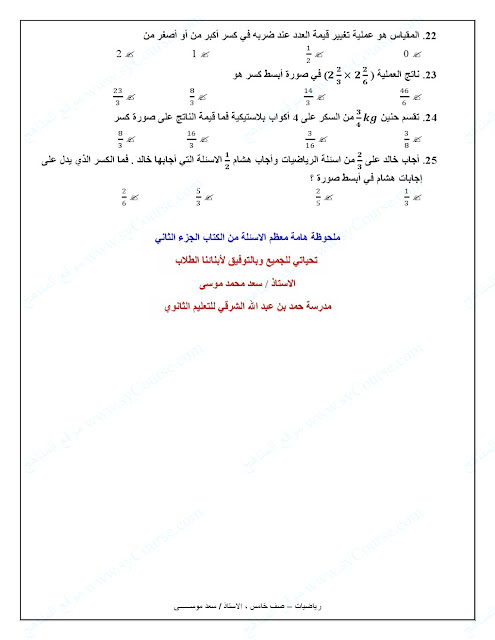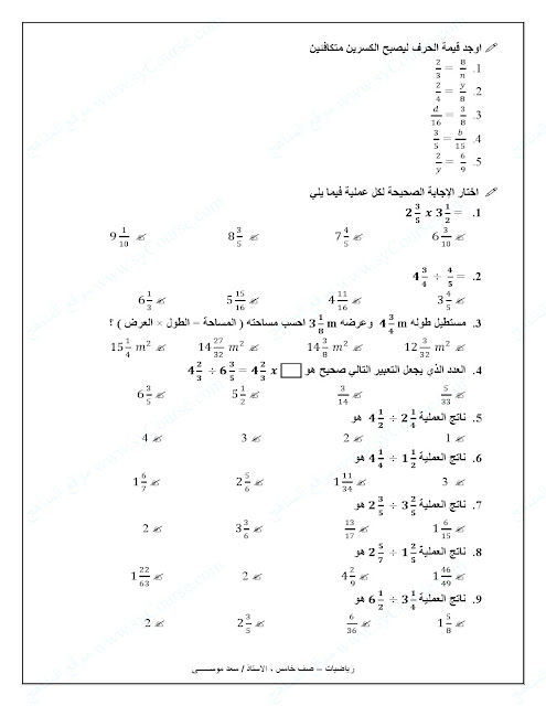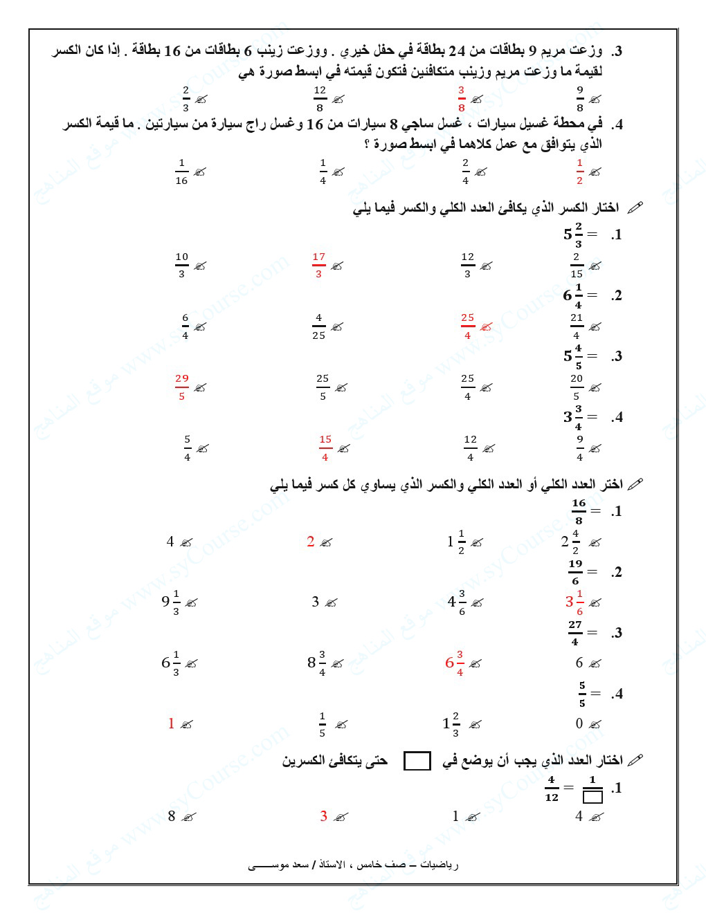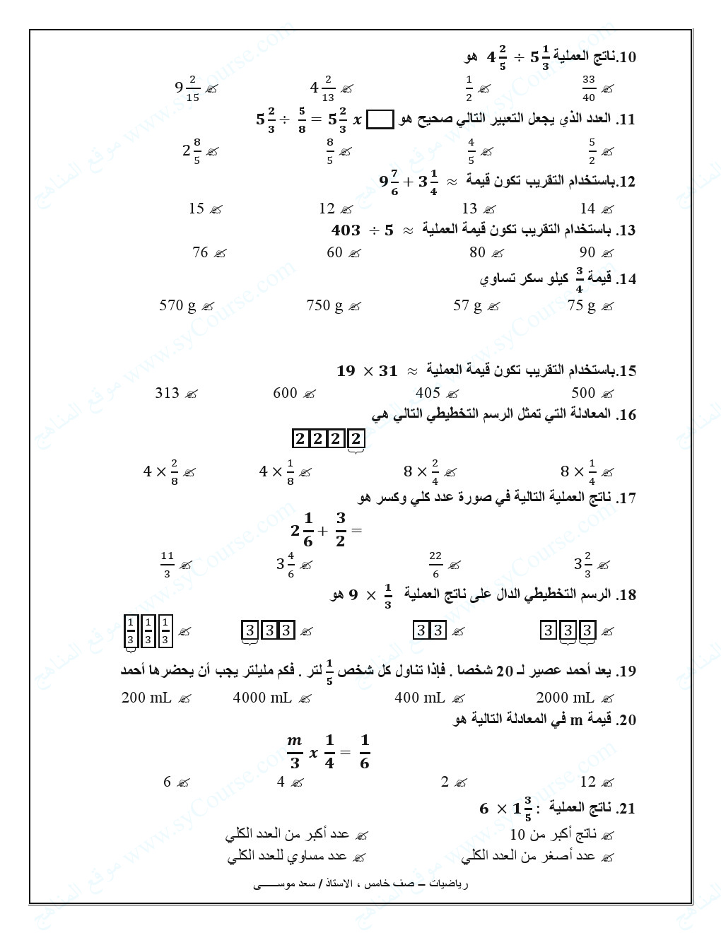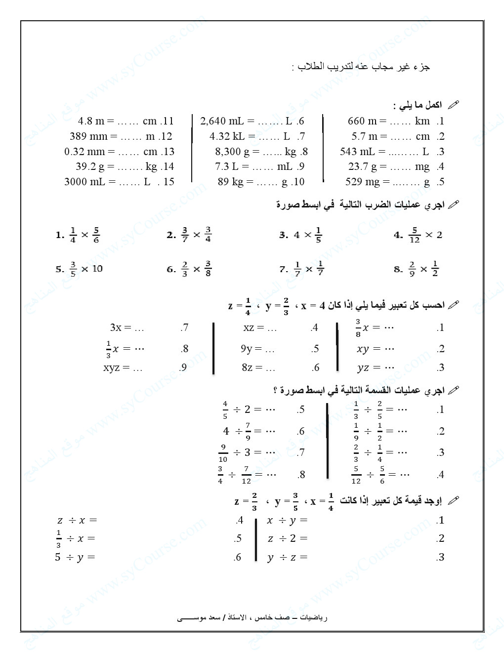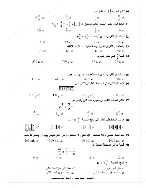الصف الخامس, الفصل الثالث, رياضيات, أوراق عمل شاملة لمنتصف الفصل الثالث |