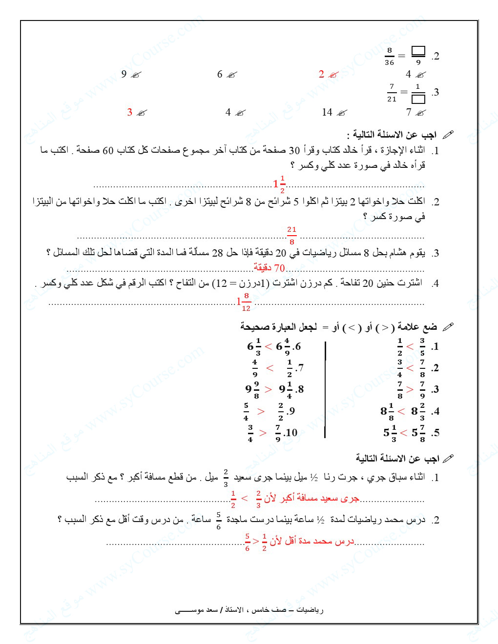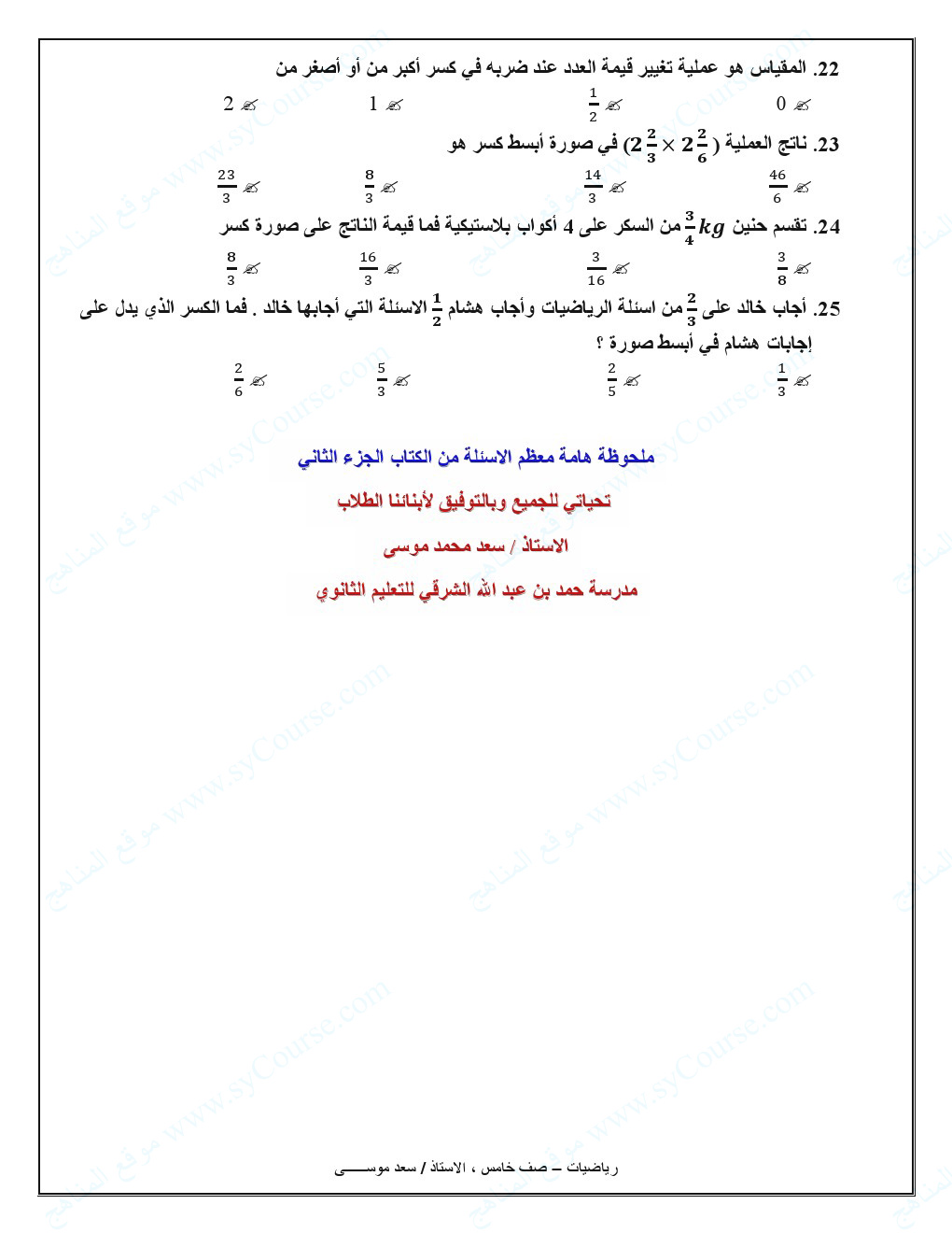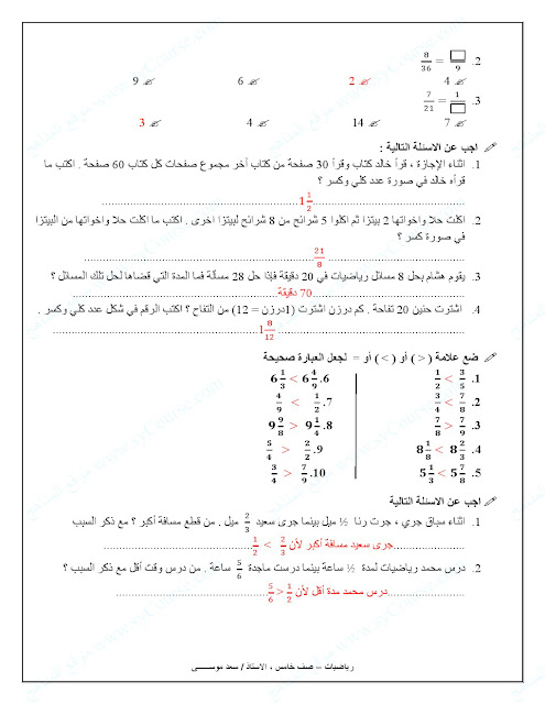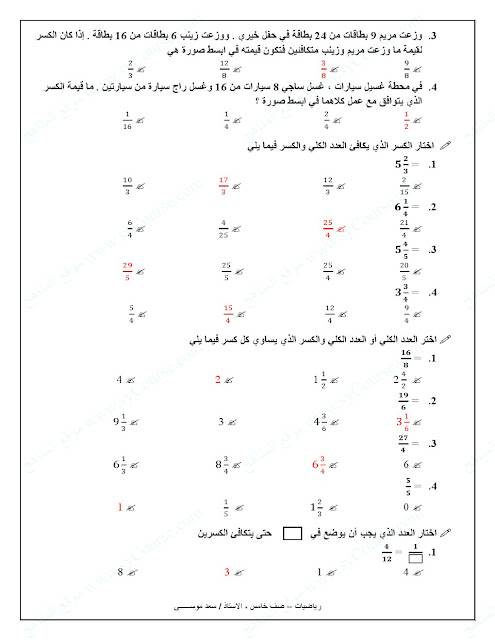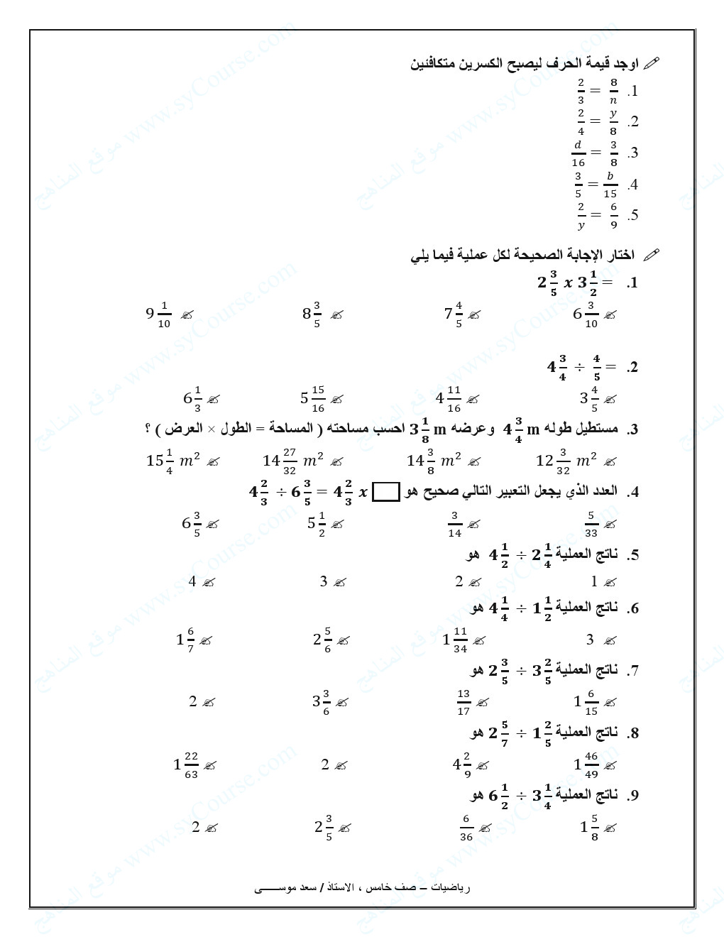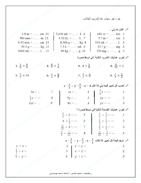 الصف الخامس, الفصل الثالث, رياضيات, أوراق عمل شاملة لمنتصف الفصل الثالث |