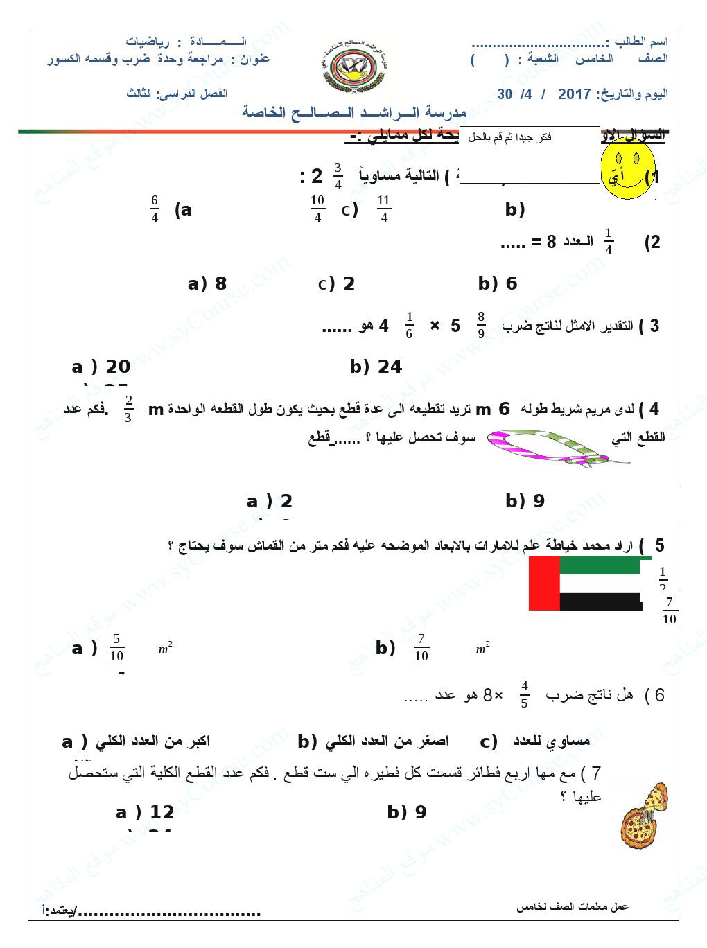 | الصف الخامس, الفصل الثالث, رياضيات, مراجعة لضرب وقسمة الكسور | ||