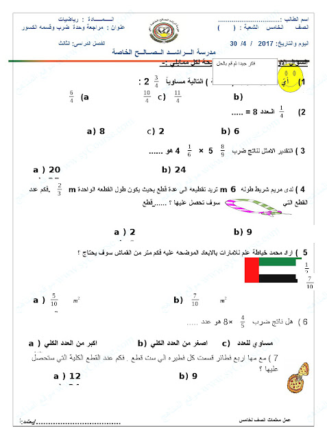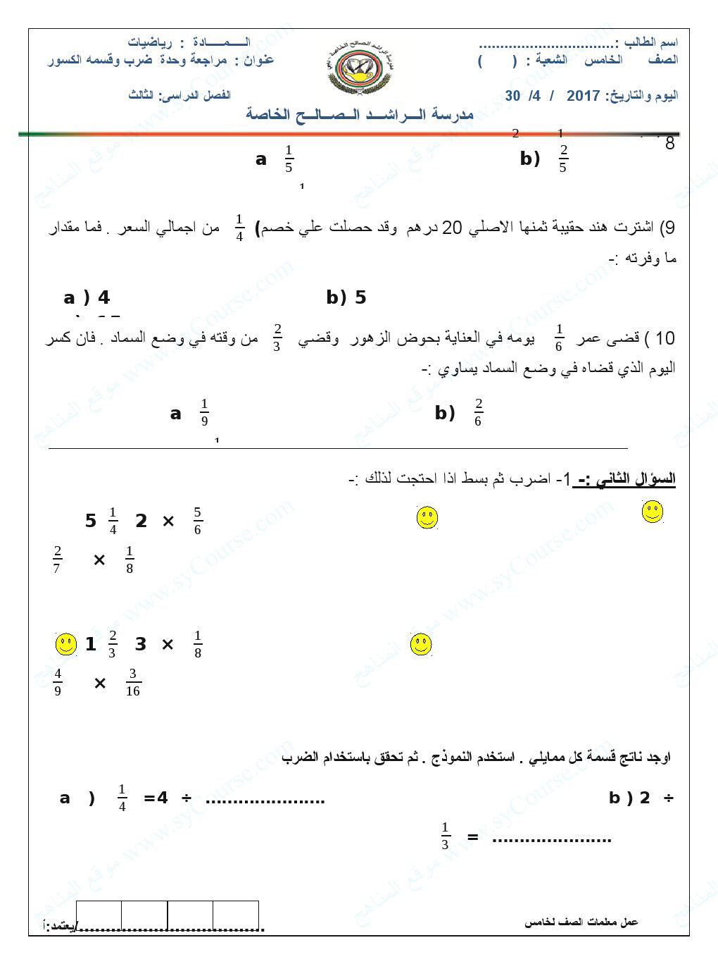 معلومات الملف: الصف الخامس, الفصل الثالث, رياضيات, مراجعة لضرب وقسمة الكسور | ||