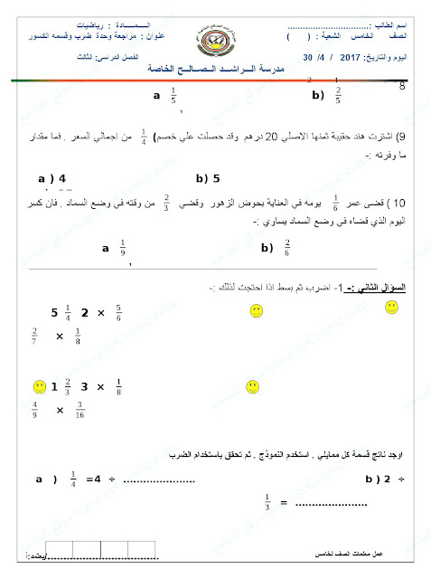 الصف الخامس, الفصل الثالث, رياضيات, مراجعة لضرب وقسمة الكسور |