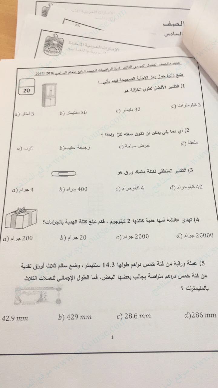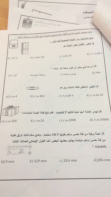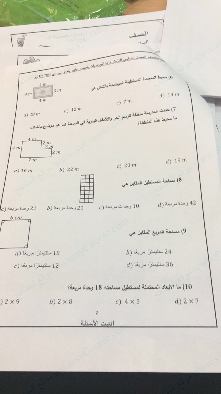 الصف الرابع, الفصل الثالث, رياضيات, أسئلة الامتحان الوزاري لمنتصف الفصل الثالث |
