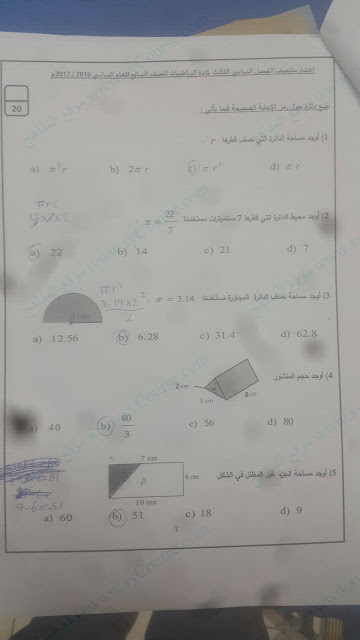 | الصف السابع, الفصل الثالث, رياضيات, أسئلة الامتحان الوزاري لمنتصف الفصل الثالث 2017 | ||