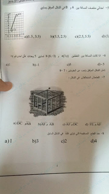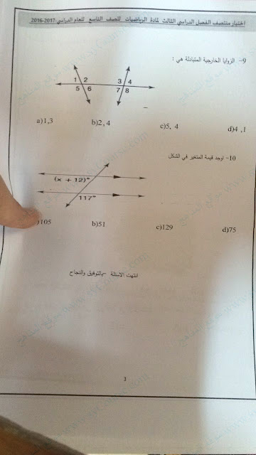 الصف التاسع, الفصل الثالث, رياضيات, أسئلة الامتحان الوزاري لمنتصف الفصل الثالث 2017 |