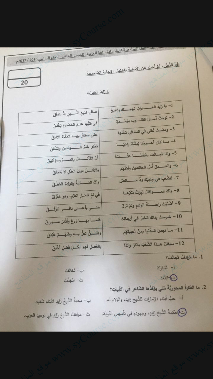 | الصف العاشر, الفصل الثالث, لغة عربية, أسئلة الامتحان الوزاري لمنتصف الفصل الثالث 2017 | ||