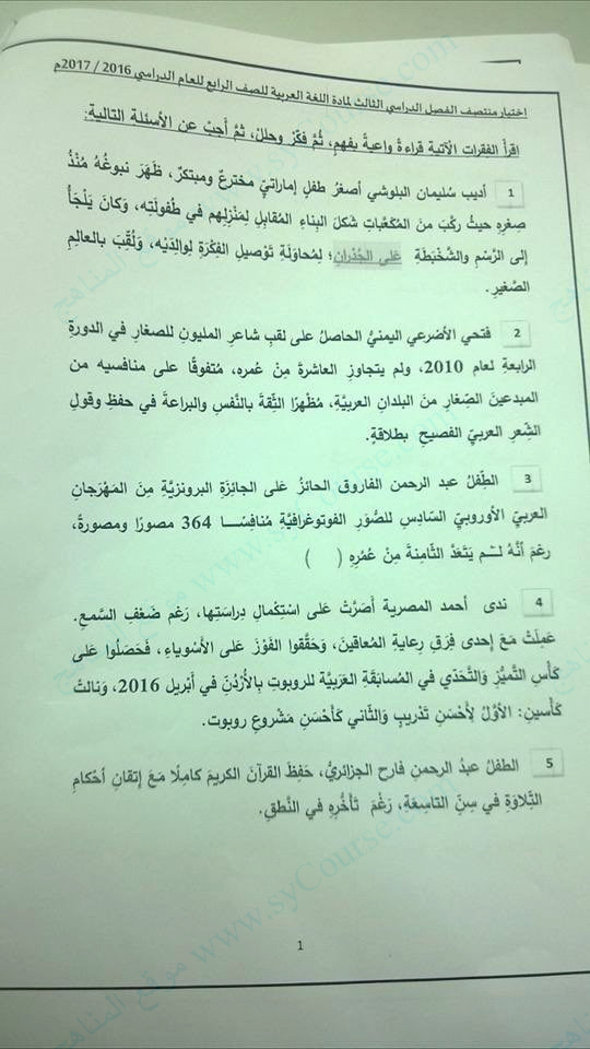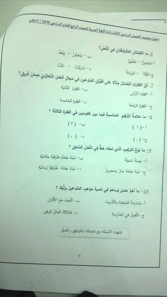 | الصف الرابع, الفصل الثالث, لغة عربية, أسئلة الامتحان الوزاري لمنتصف الفصل الثالث 2017 | ||