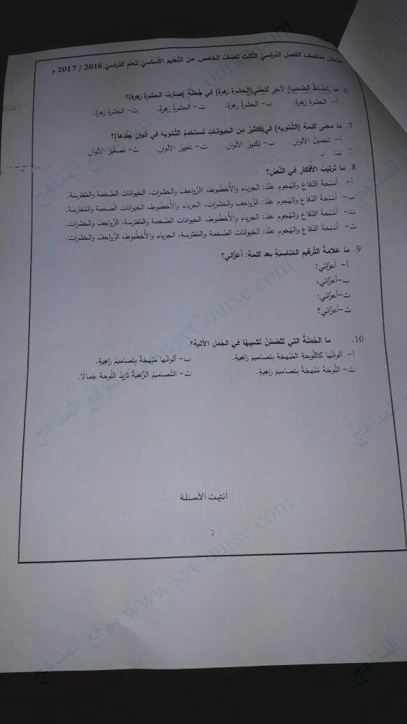 | الصف الخامس, الفصل الثالث, لغة عربية, الاختبار الوزاري لمنتصف الفصل الثالث 2017 | ||
