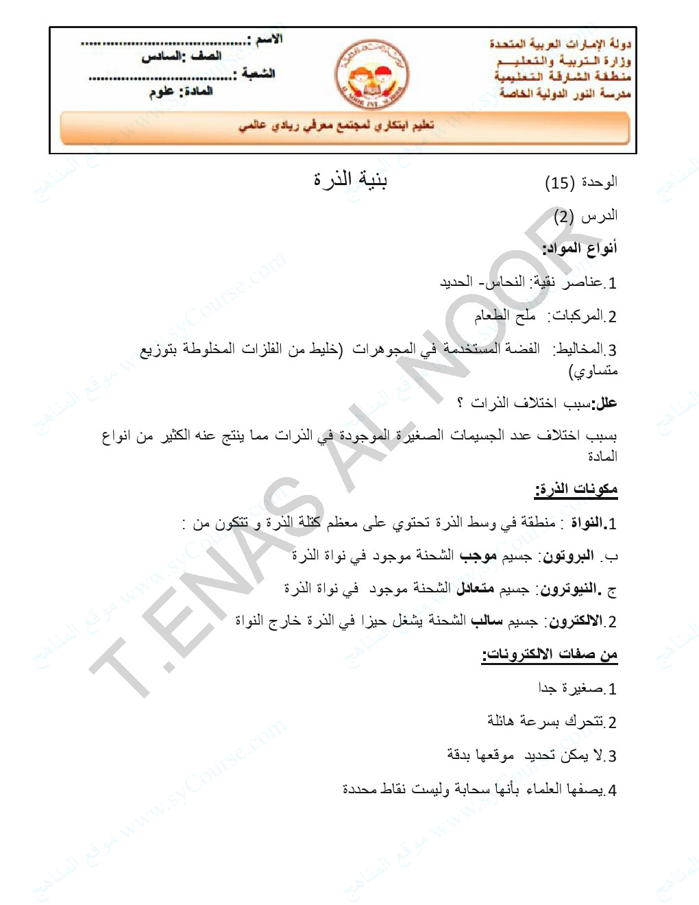 معلومات الملف: الصف السادس, الفصل الثالث, علوم, أوراق عمل (بنية الذرة) مع الحل | ||