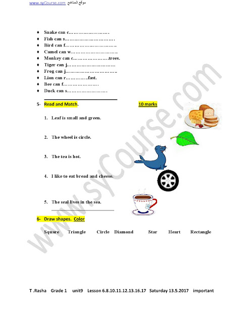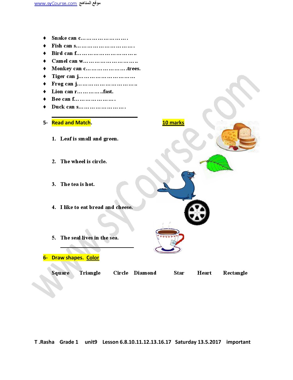 معلومات الملف: الصف الأول, الفصل الثالث, لغة انكليزية, أوراق عمل الوحدة التاسعة. | |||