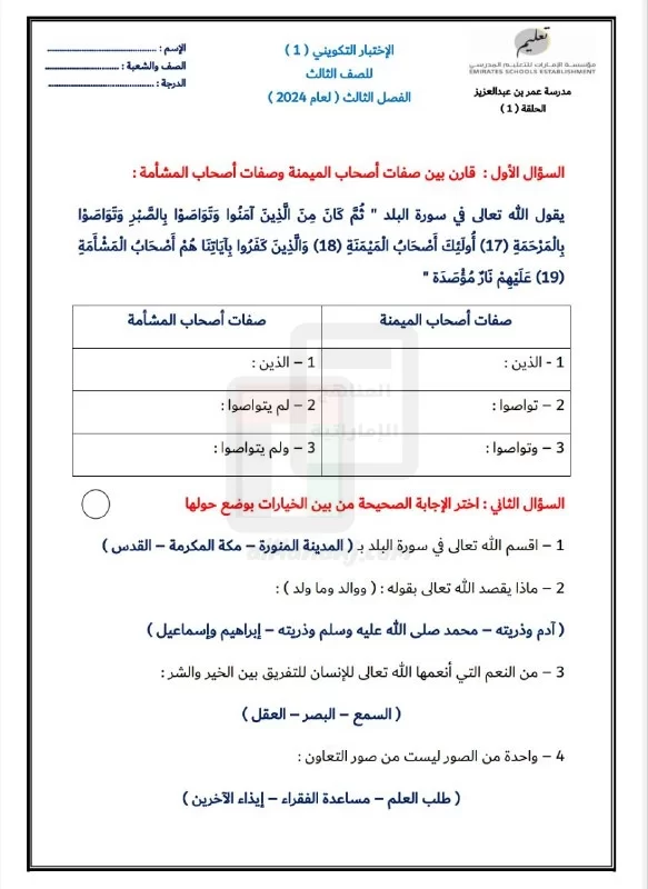 أسئلة الاختبار التكويني الأول - إعداد: مدرسة عمر بن عبدالعزيز | ||